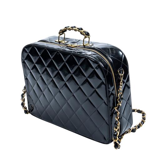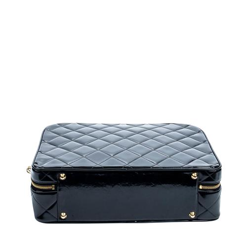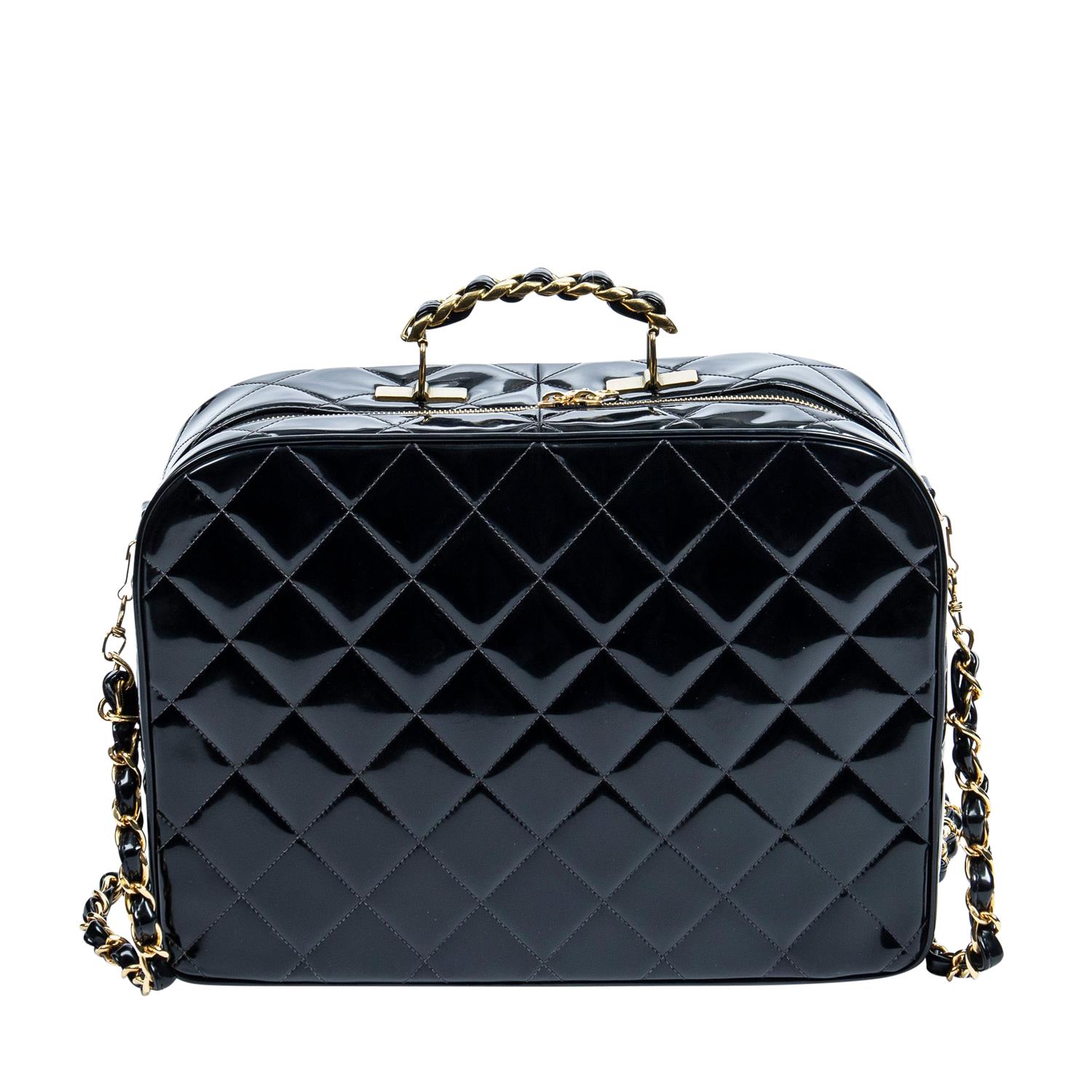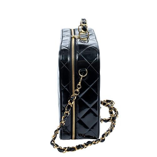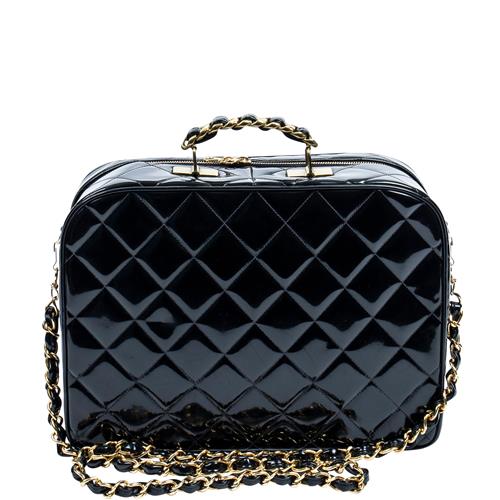 Styled in black quilted patent leather with interlaced chain shoulder strap and gold tone metal hardware, 34.5 x 25.5 x 10cm.