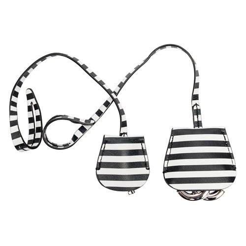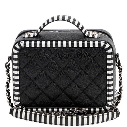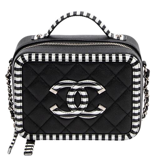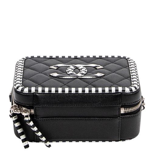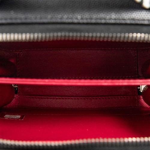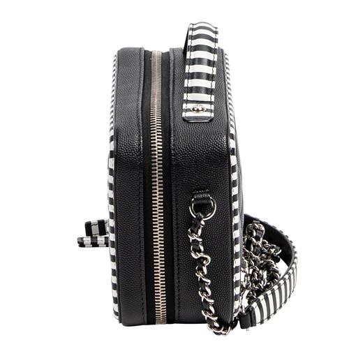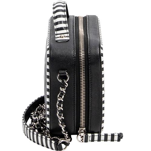 Styled in black caviar leather with black and white trim, interlaced chain shoulder strap and silver tone metal hardware, 16.5 x 13 x 7cm.