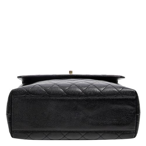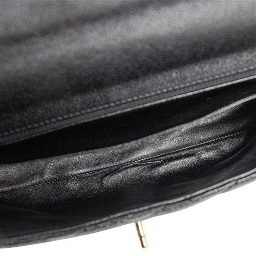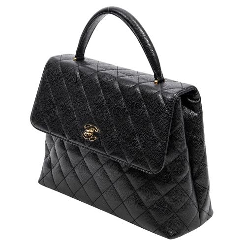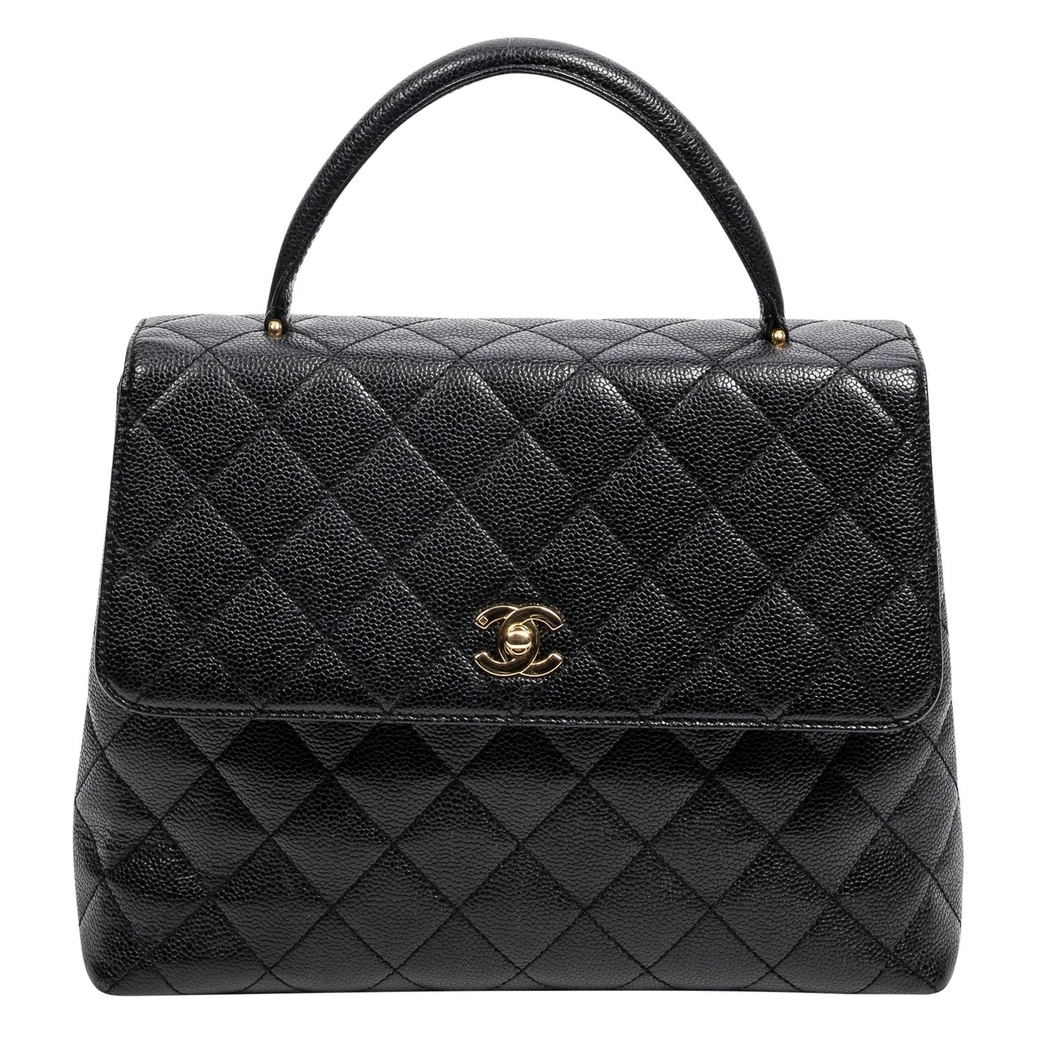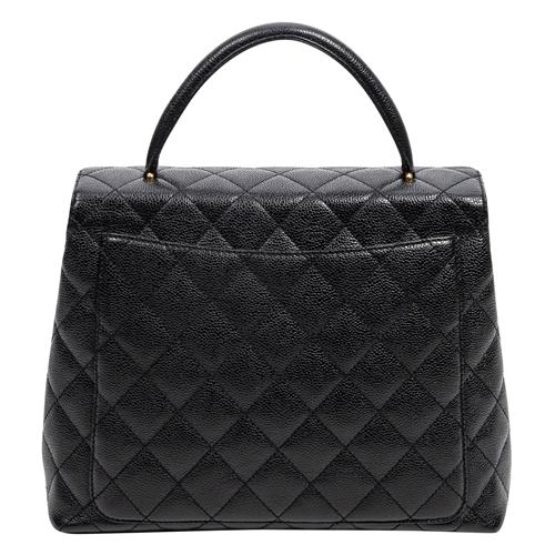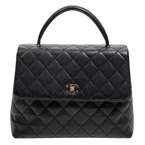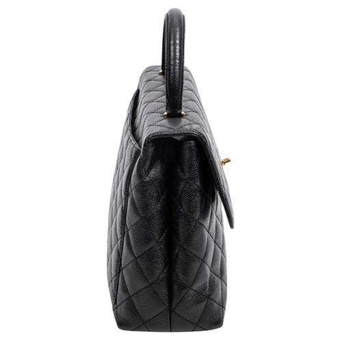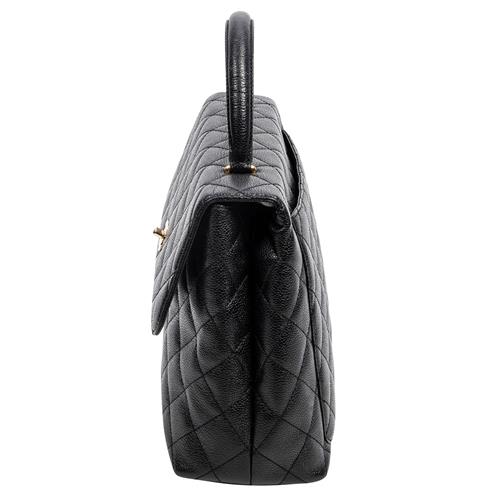 Styled in black quilted leather with gold metal hardware, 31 x 22 x 11cm.