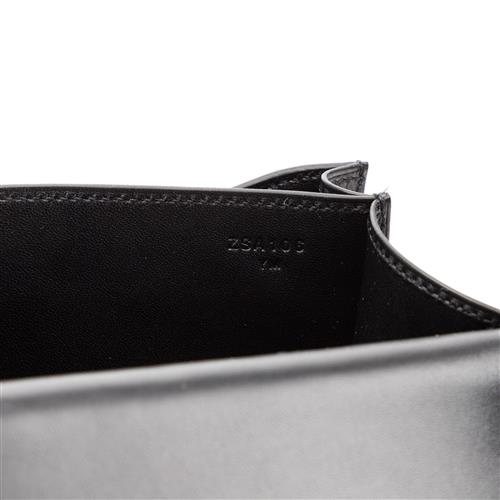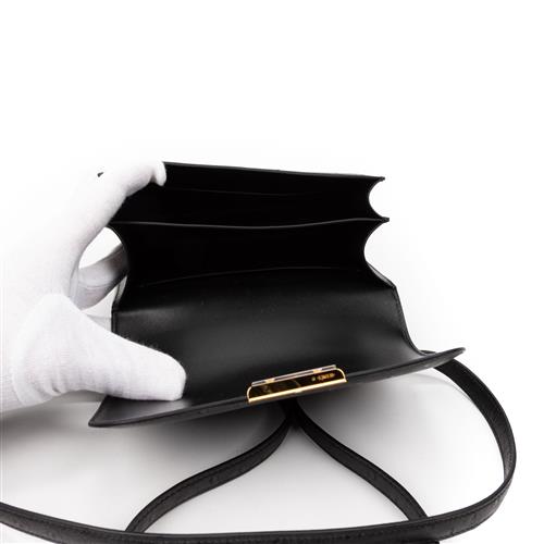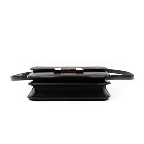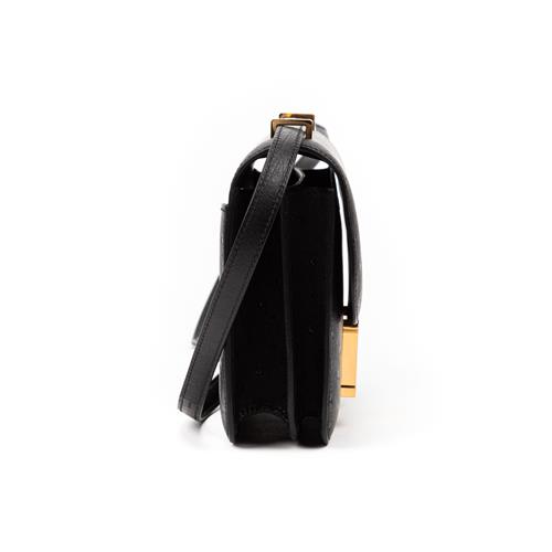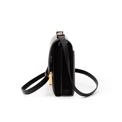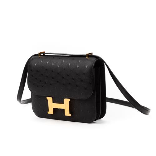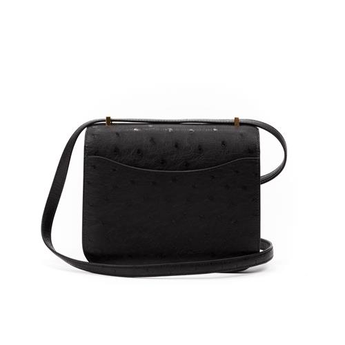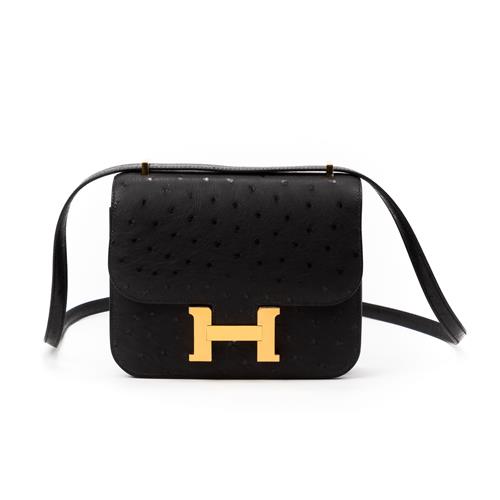 Styled in black ostrich leather with conforming leather strap and Champaign gold tone metal hardware, 18 x 15 x 4cm.