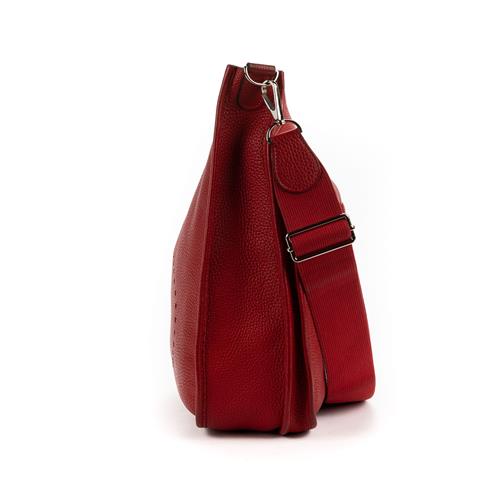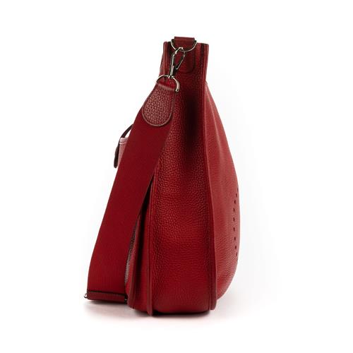 Styled in grained red leather with detachable canvas shoulder strap and silver tone hardware, 32 x 32 10.5cm.