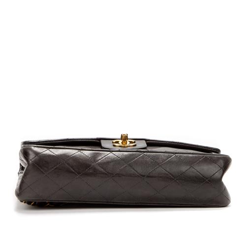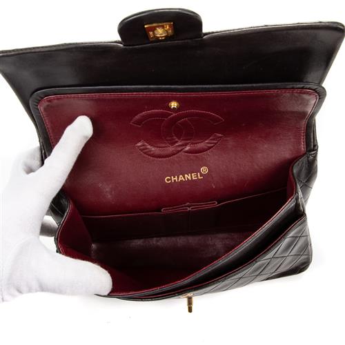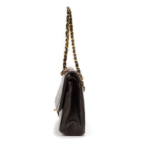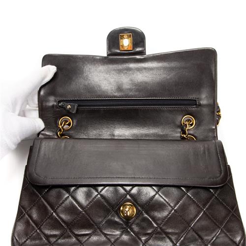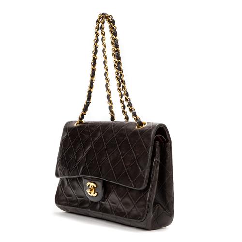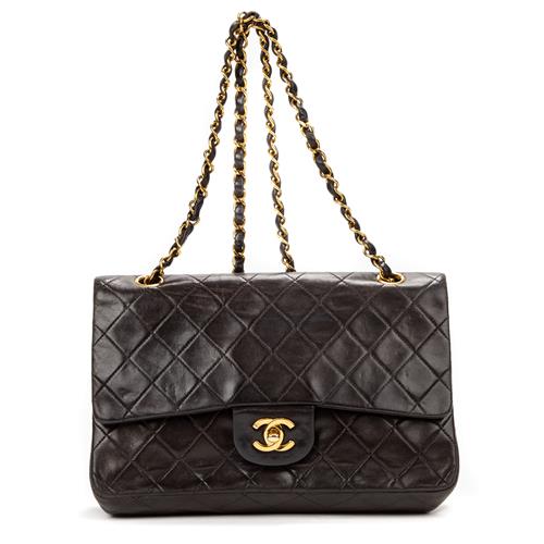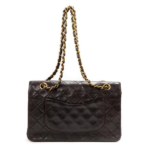 Styled in black quilted calf leather with interlaced chain shoulder strap and gold tone metal hardware, 26 x 16 x 7cm.