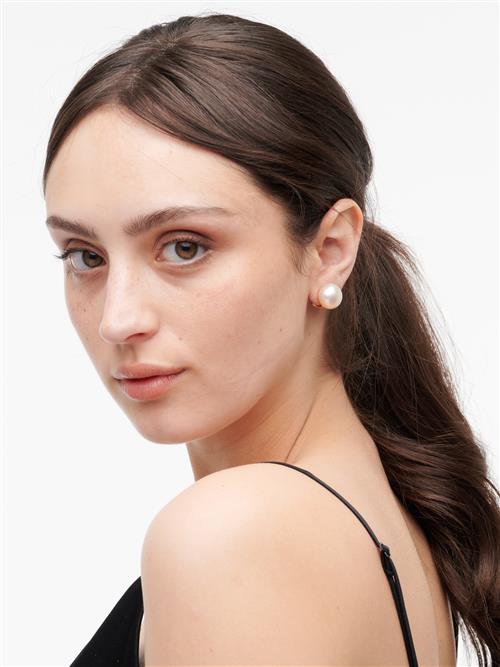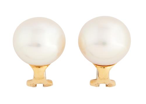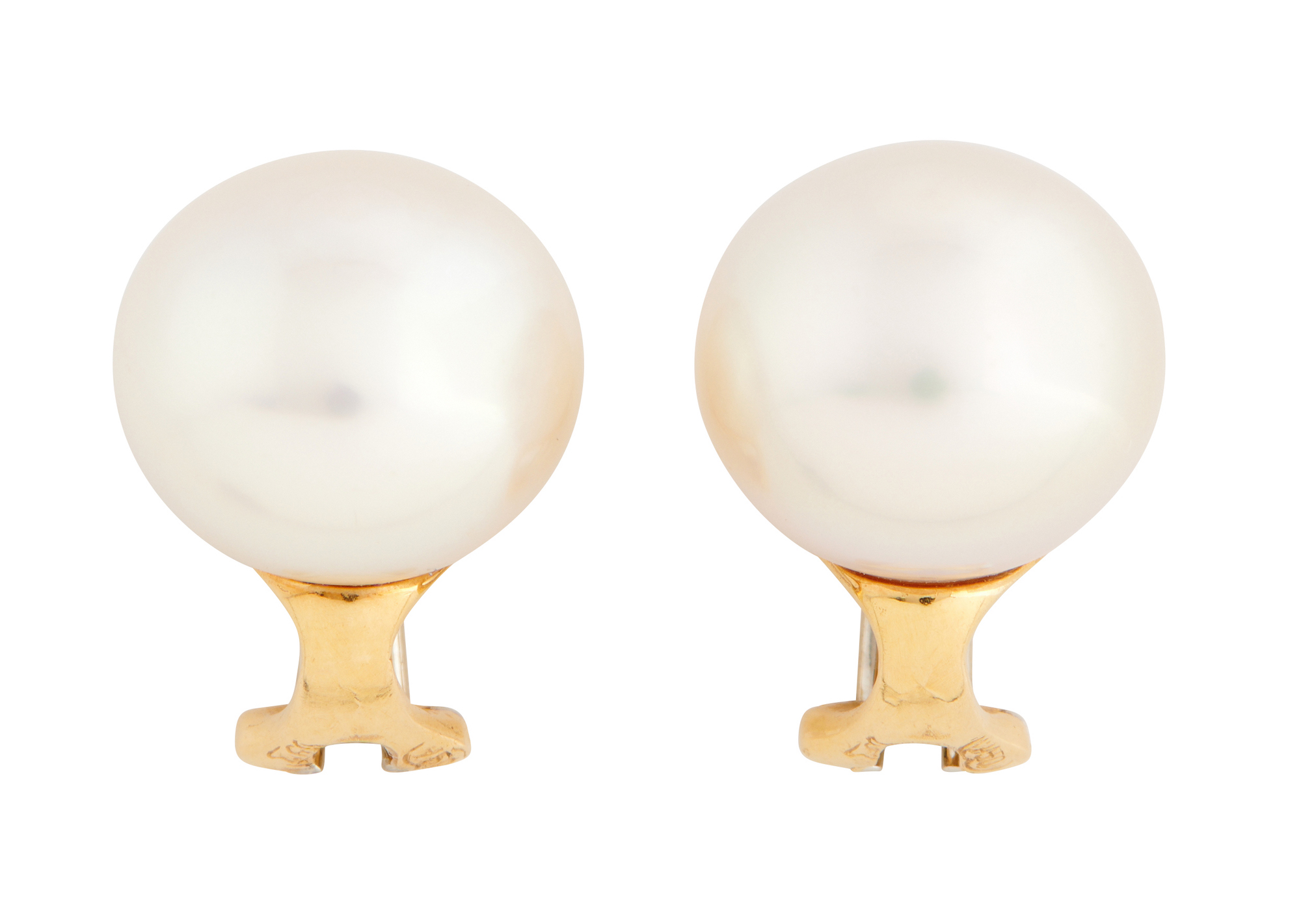 Each earring comprising a button shaped pearl of cream-white hues measuring approximately 13.8mm, signed P for Paspaley, to clip fittings, length approximately 12mm.