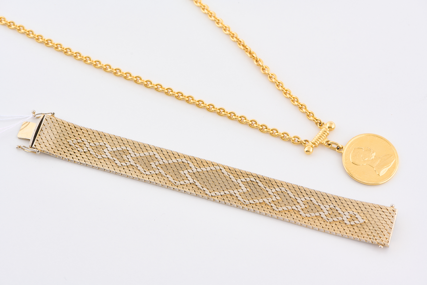 A VINTAGE COIN PENDANT (DIAMETER 29MM) NECKLACE IN GOLD PLATE BY BEN-AMUN AND VINTAGE COSTUME BRACELET (190MM X 20MM)