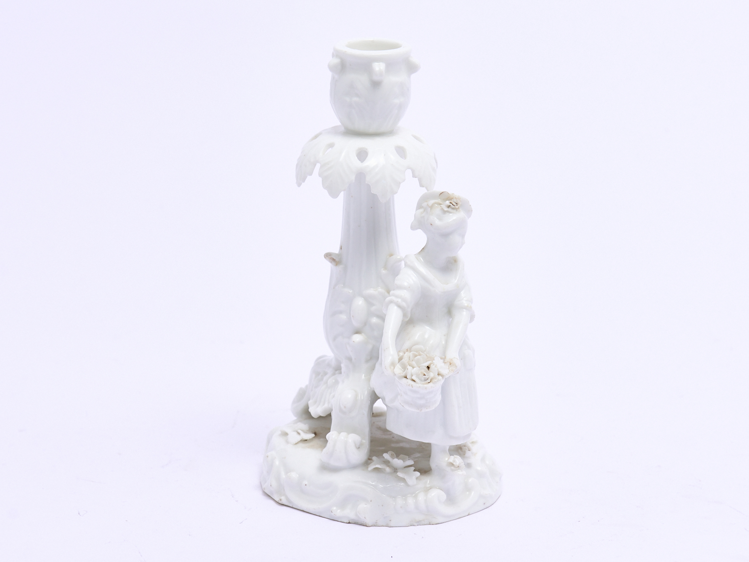 A LATE 19TH CENTURY FRENCH PORCELAIN CANDELSTICK H.20CM (CHIP TO HAND), LEONARD JOEL LOCAL DELIVERY: SMALL