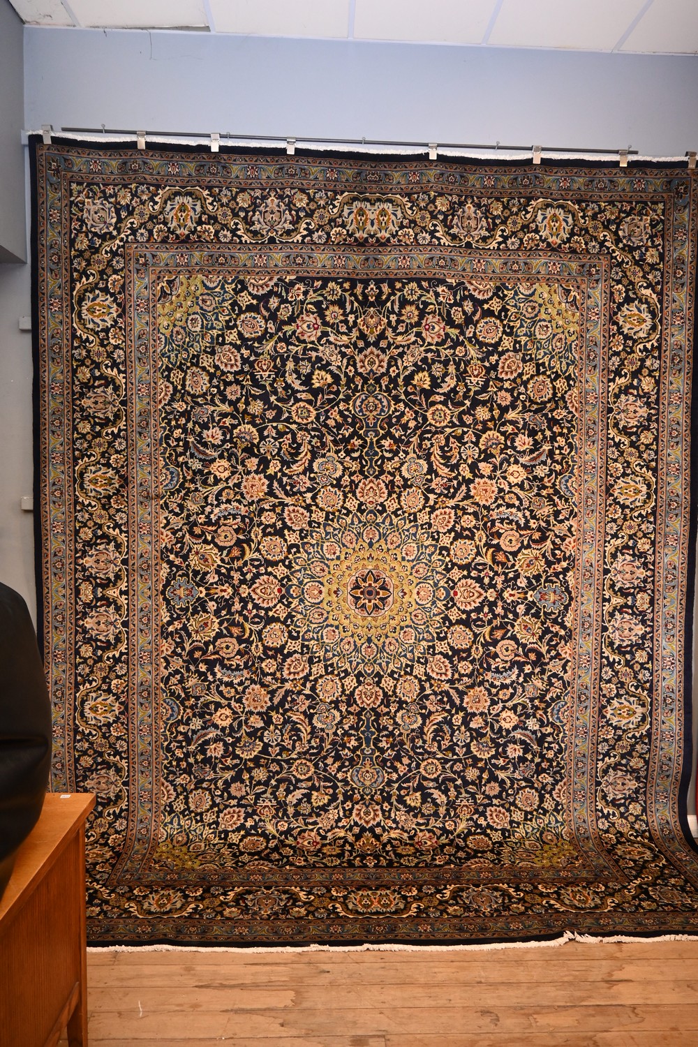 A MAGNIFICENT PERSIAN ROYAL KASHMAR CARPET. 100% WOOL, FINELY AND VERY DENSELY HAND KNOTTED WITH LUSTROUS HEAVY HIGH WOOL PILE. THE CARPET HAS A VIBRANT SUNBURST ELONGATED CENTRAL MEDALLION IN A UNIQUE OLIVE GREEN TONE ON A DEEP PERSIAN INDIGO BLUE FIELD WITH DOUBLE CHANDELIERS SURROUNDING THE TOP & BOTTOM OF THE MEDALLION IN TONES OF FRENCH BLUE, GOLD AND CHAMPAIGN COLOURS. BORDERS OF PALMETTES & FLORAL MOTIFS. SUPERBLY HAND KNOTTED IN EXCELLENT CLEAN CONDITION. FROM CENTRAL EAST OF PERSIA. SIZE: 390 X 310 CM - RRP: $8,900 DOCUMENTATION OF AUTHENTICITY INCLUDED.