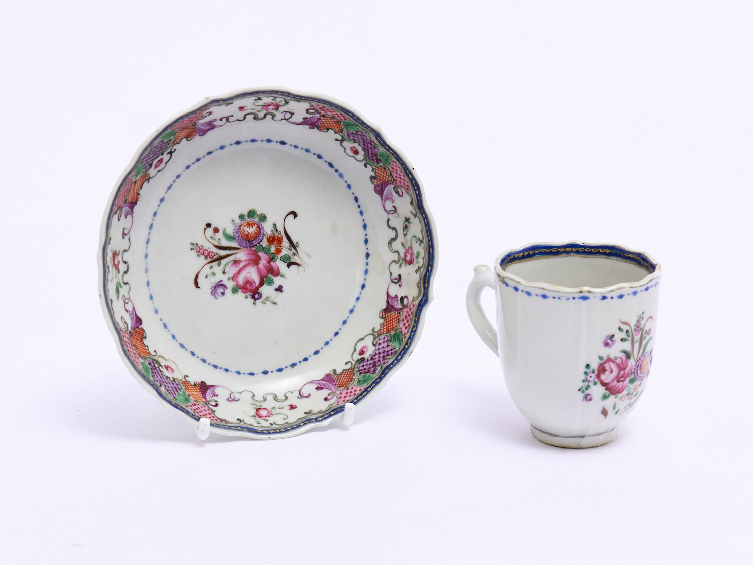 A FAMILLE ROSE COFFEE CAN AND SAUCER, QIAN LONG DIA.12.5CM (HAIRLINE TO CUP), LEONARD JOEL LOCAL DELIVERY: SMALL