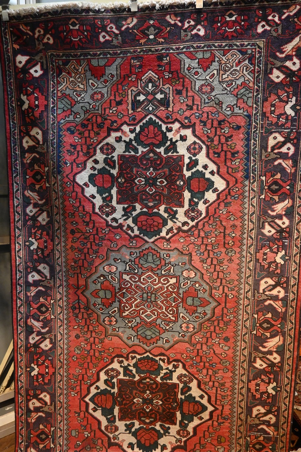 A CIRCA 1950'S PERSIAN BAKHTIAR GULPAIGAN RUG, 100% WOOL & NATURAL DYES, VINTAGE PILE. HAND-KNOTTED WITH TRIPLE CENTRAL FLORAL MEDALLION AND CORNER MEDALLIONS ON A RED FIELD OF TREE OF LIFE DESIGN. ALL OVER COLOUR TONES OF RED, GREEN, AND BLUES. BORDER OF TRIBAL PALMETTES. SOME RESTORATIONS (AF).