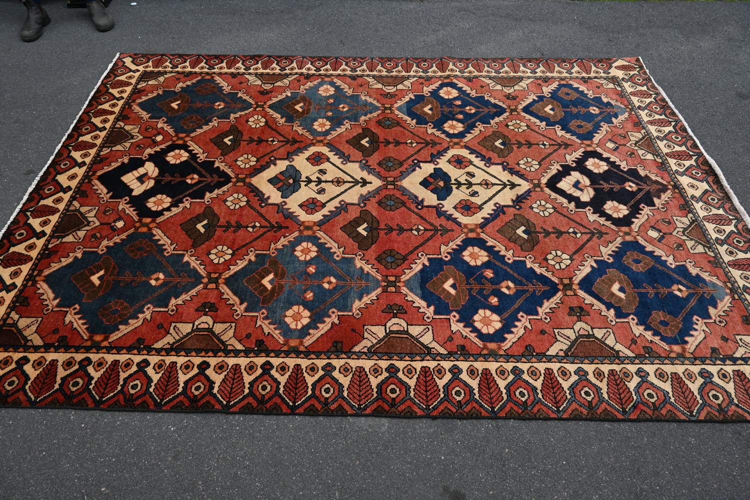 A TRIBAL PERSIAN BAKHTIARI RUG, 100% WOOL, NATURAL DYES. HAND-KNOTTED TRIBAL WEAVE AND DESIGN OF ALL OVER DIAMOND MEDALLIONS CONTAINING FLORAL PATTERNS ON A RUST TONE FIELD. BORDER OF TRIBAL CYPRESS AND GEOMETRIC DESIGNS. SOME ABRASH. SIZE: 298 X 205 CM ORIGIN: IRAN - RRP: $2,900 DOCUMENTATION OF AUTHENTICITY INCLUDED.
