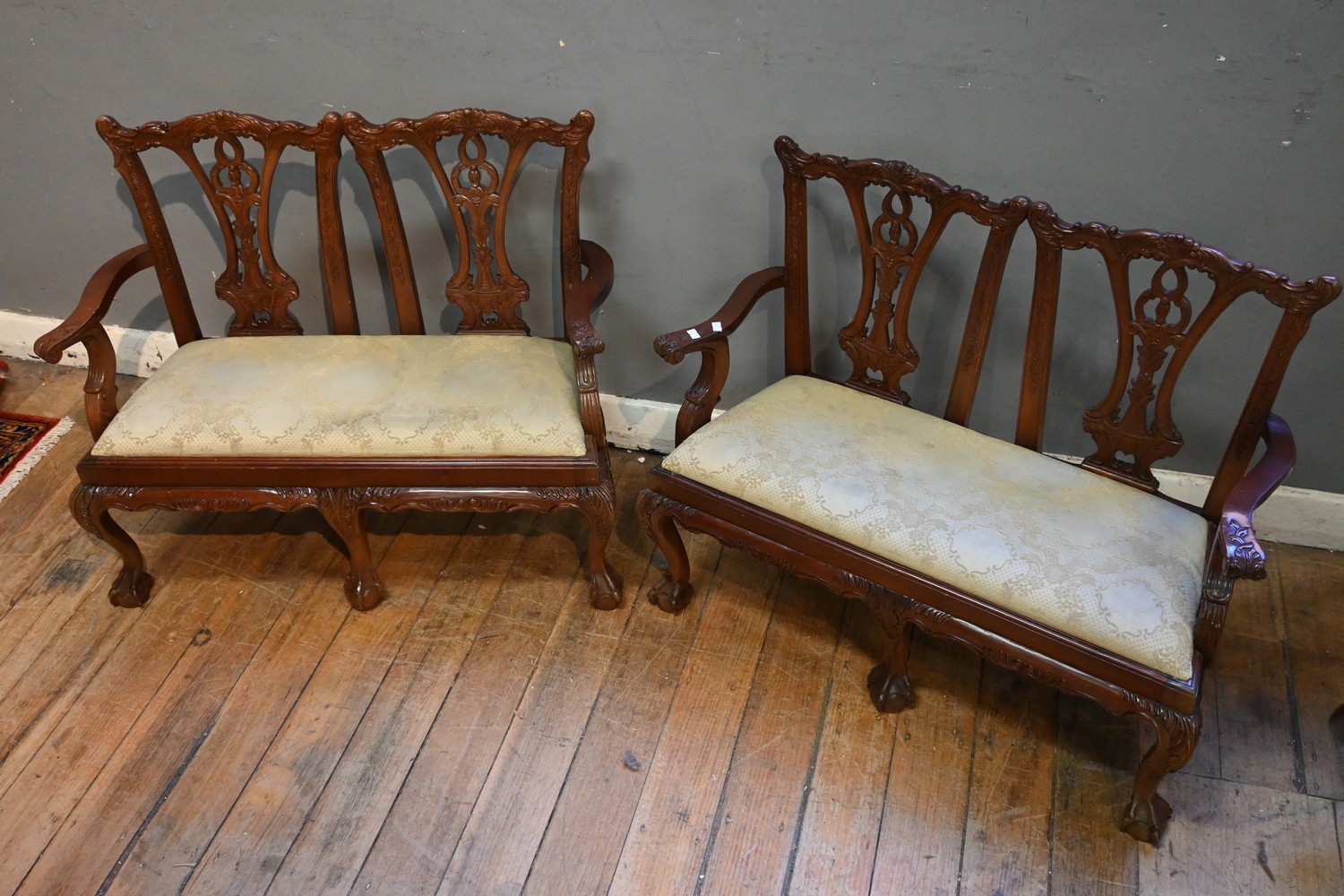 A PAIR OF CHIPPENDALE STYLE CHILDREN'S SOFAS (A/F) (66H X 82W X 39D CM) (LEONARD JOEL DELIVERY SIZE: MEDIUM)