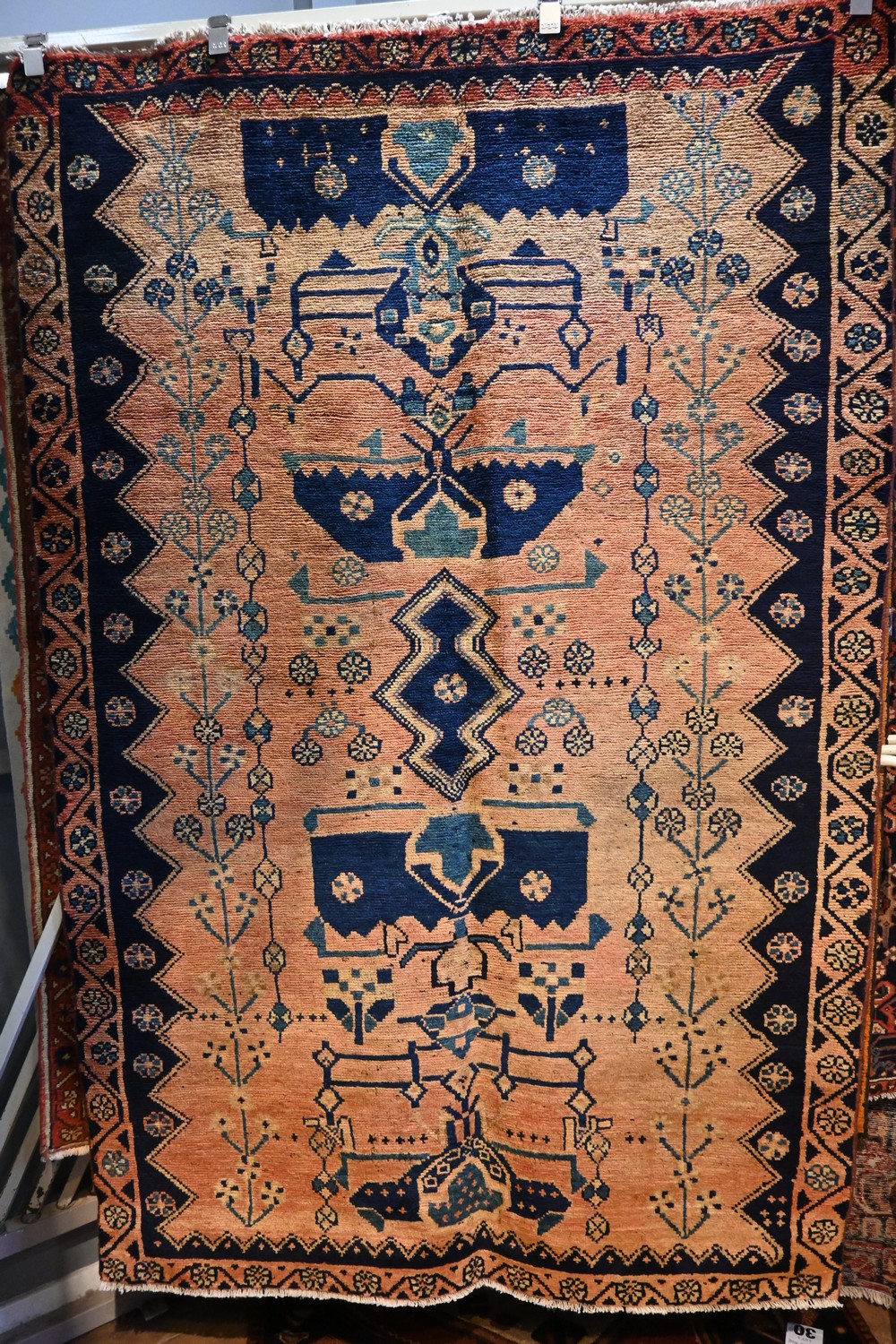A PERSIAN NOMADIC CIRCA 1970'S LURI RUG. 100% WOOL AND NATURAL DYES. VINTAGE PILE, HAND KNOTTED NOMADIC WEAVE WITH TRADITIONAL TRIBAL MEDALLION CONTAINING TRIBAL MOTIFS ON A SOFT RED FIELD OF TREE OF LIFE DESIGNS. BORDER OF ROSETTES AND TRIBAL MOTIFS. RESTORED TO GALLERY CONDITION. SIZE: 220 X 148 CM ORIGIN: PERSIA - RRP: $2,400 DOCUMENTATION OF AUTHENTICITY INCLUDED.