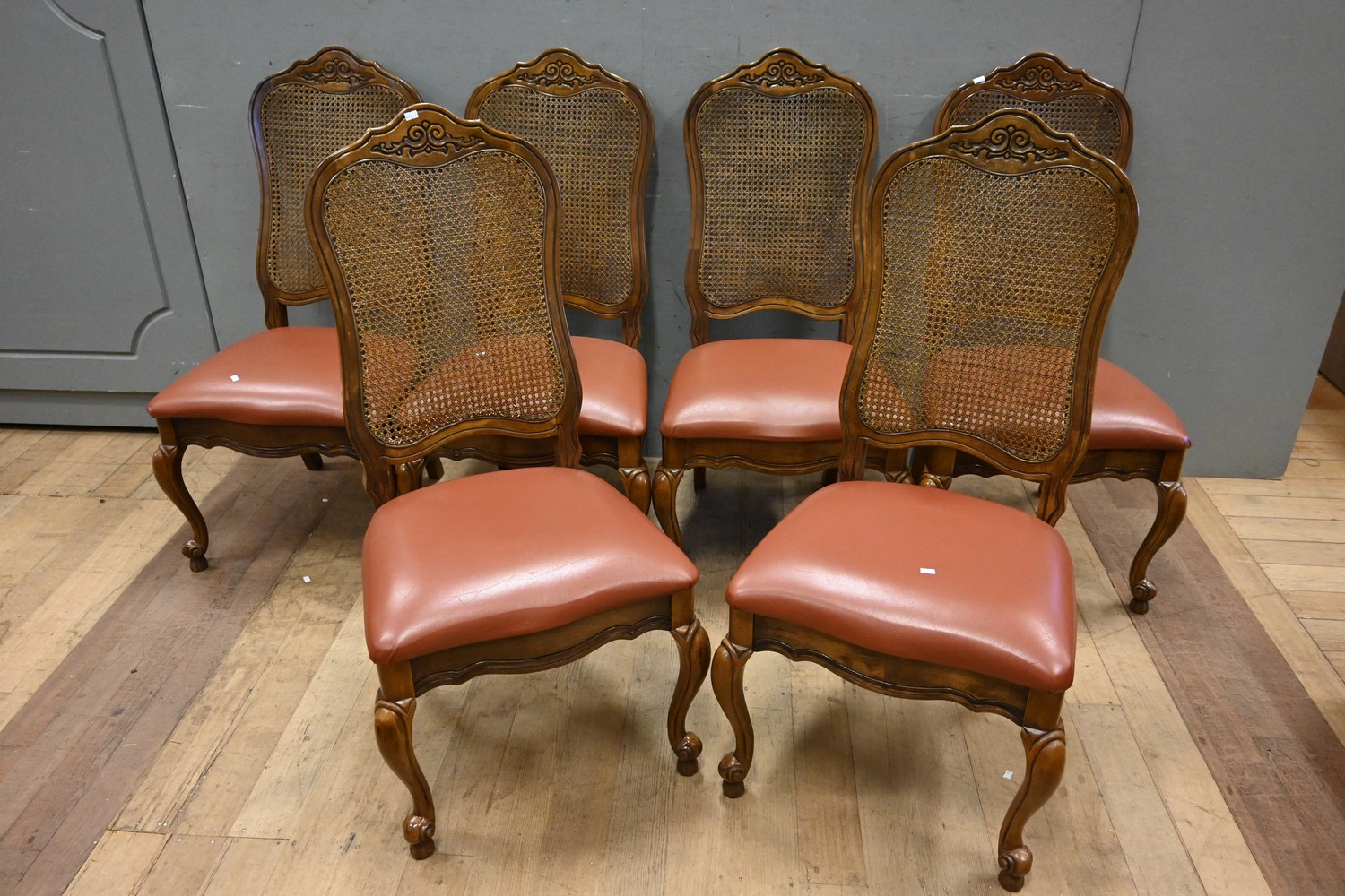 A SET OF SIX FRENCH STYLE LEATHER AND RATTAN CHAIRS (109H X 56W X 63D CM) (LEONARD JOEL DELIVERY SIZE: X-LARGE)