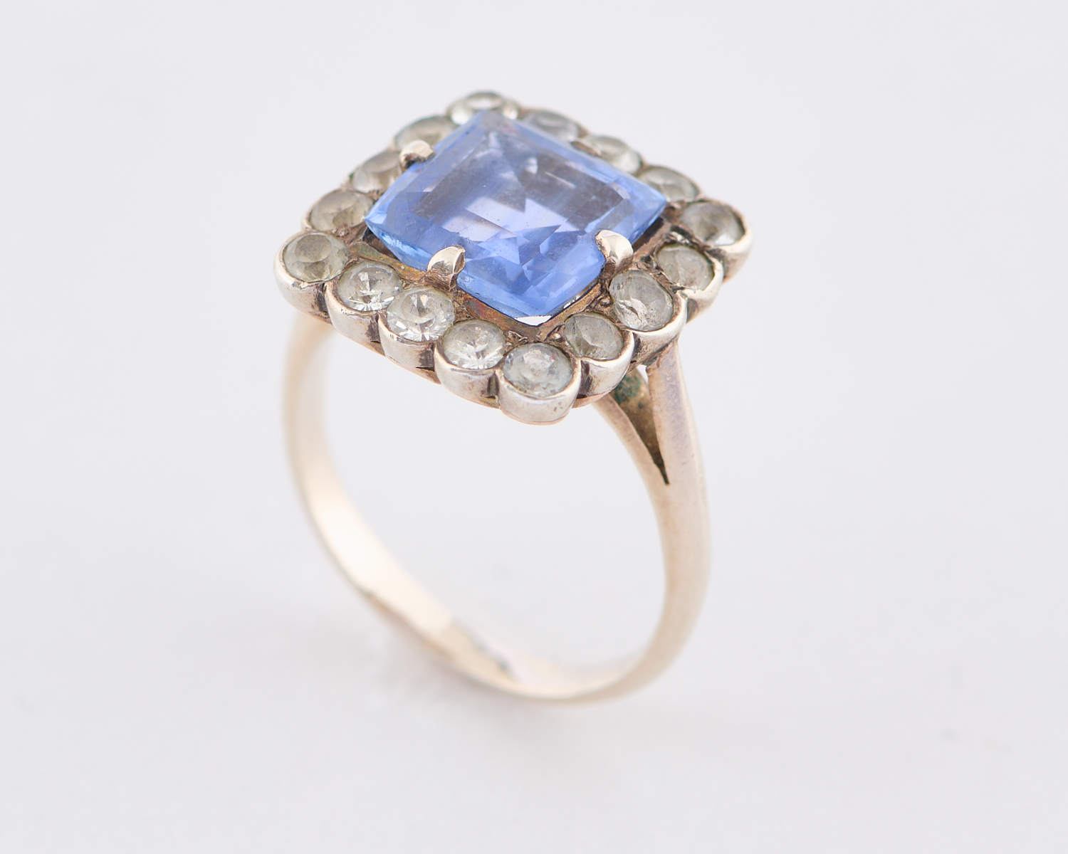 A SYNTHETIC SAPPHIRE AND WHITE SAPPHIRE PLAQUE RING IN WHITE GOLD PLATED SILVER, RING SIZE K/L