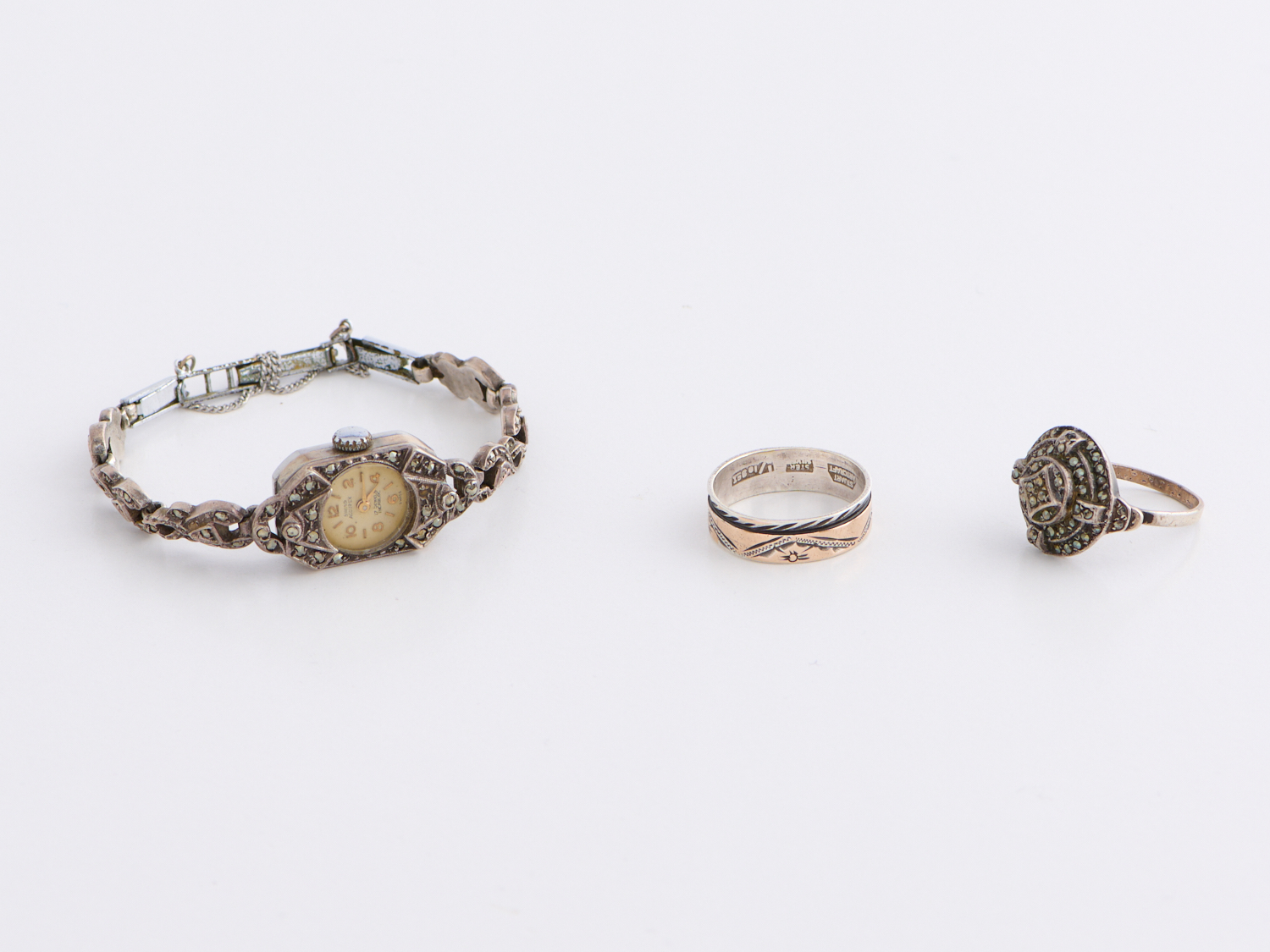 A SILVER WATCH (INNER DIAMETER 60MM), AND TWO SILVER RINGS, SIZES P AND N