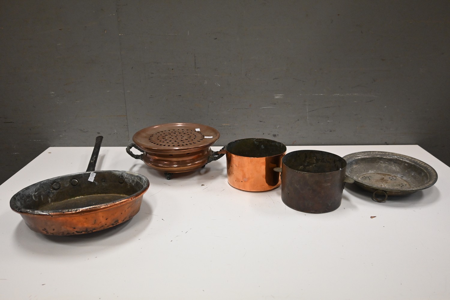 A COLLECTION OF VARIOUS COPPER COOKING POTS AND PANS (A/F) (LARGEST 28 CM D) (LEONARD JOEL DELIVERY SIZE: MEDIUM)
