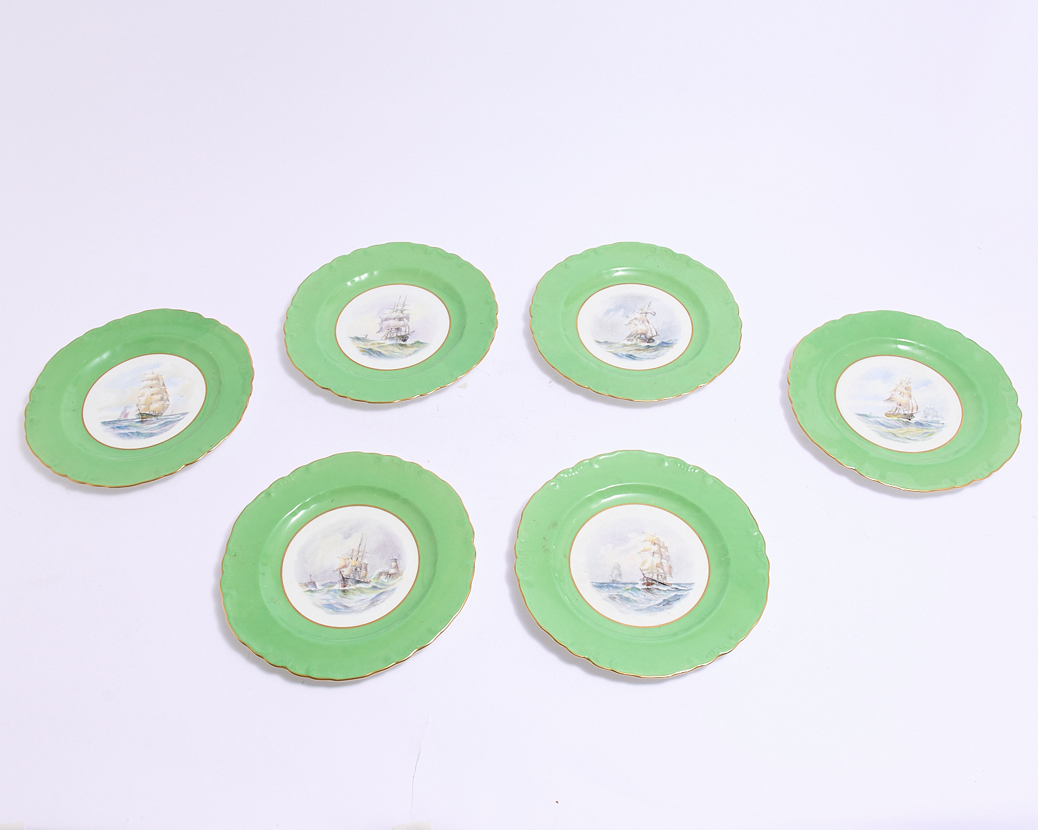 SIX ROYAL CROWN DERBY CABINET PLATES WITH HAND PAINTED SHIP DECORATION SIGNED W E J DEAN DIA.21.5CM, LEONARD JOEL LOCAL DELIVERY: SMALL