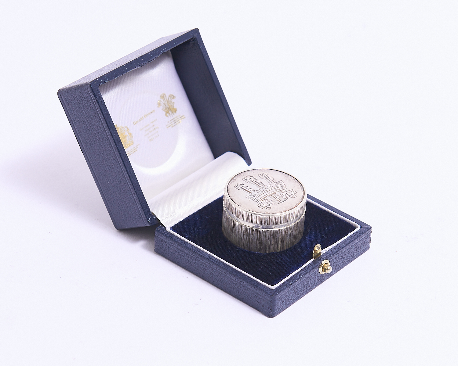 A STERLING SILVER PILL BOX BY GERALD BENNEY WITH THE HERALDIC BADGE OF HIS ROYAL HIGHNESS THE PRINCE OF WALES TO TOP H.2.2CM X DIA.3.5CM, LEONARD JOEL LOCAL DELIVERY: SMALL