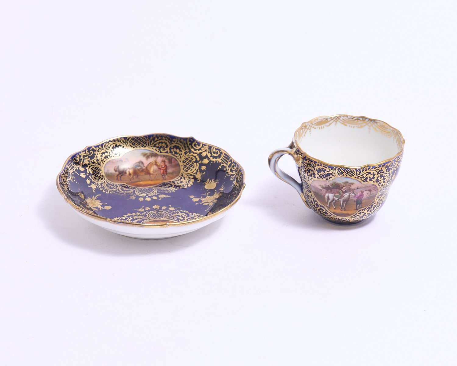 A DEMI TASSE CUP AND SAUCER WITH MEISSEN MARK TO BASE, LEONARD JOEL LOCAL DELIVERY: SMALL