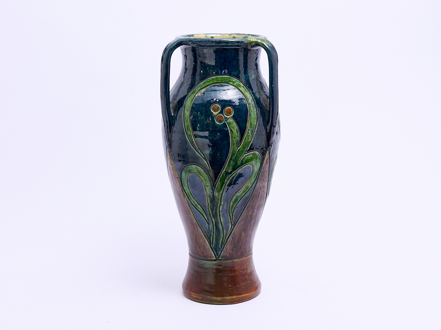 A MAJOLICA THREE HANDLED VASE (A/F) H.45CM, LEONARD JOEL LOCAL DELIVERY: MEDIUM