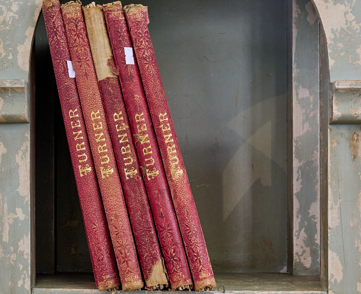 THE TURNER GALLERY, A SERIES OF ONE HUNDRED AND TWENTY ENGRAVINGS FROM THE WORKS OF THE LATE J.M.W. TURNER R.A., THE DESCRIPTIVE TEST BY W. COSMO MONKHOUSE, FIVE VOLUMES (A/F), LEONARD JOEL LOCAL DELIVERY: MEDIUM