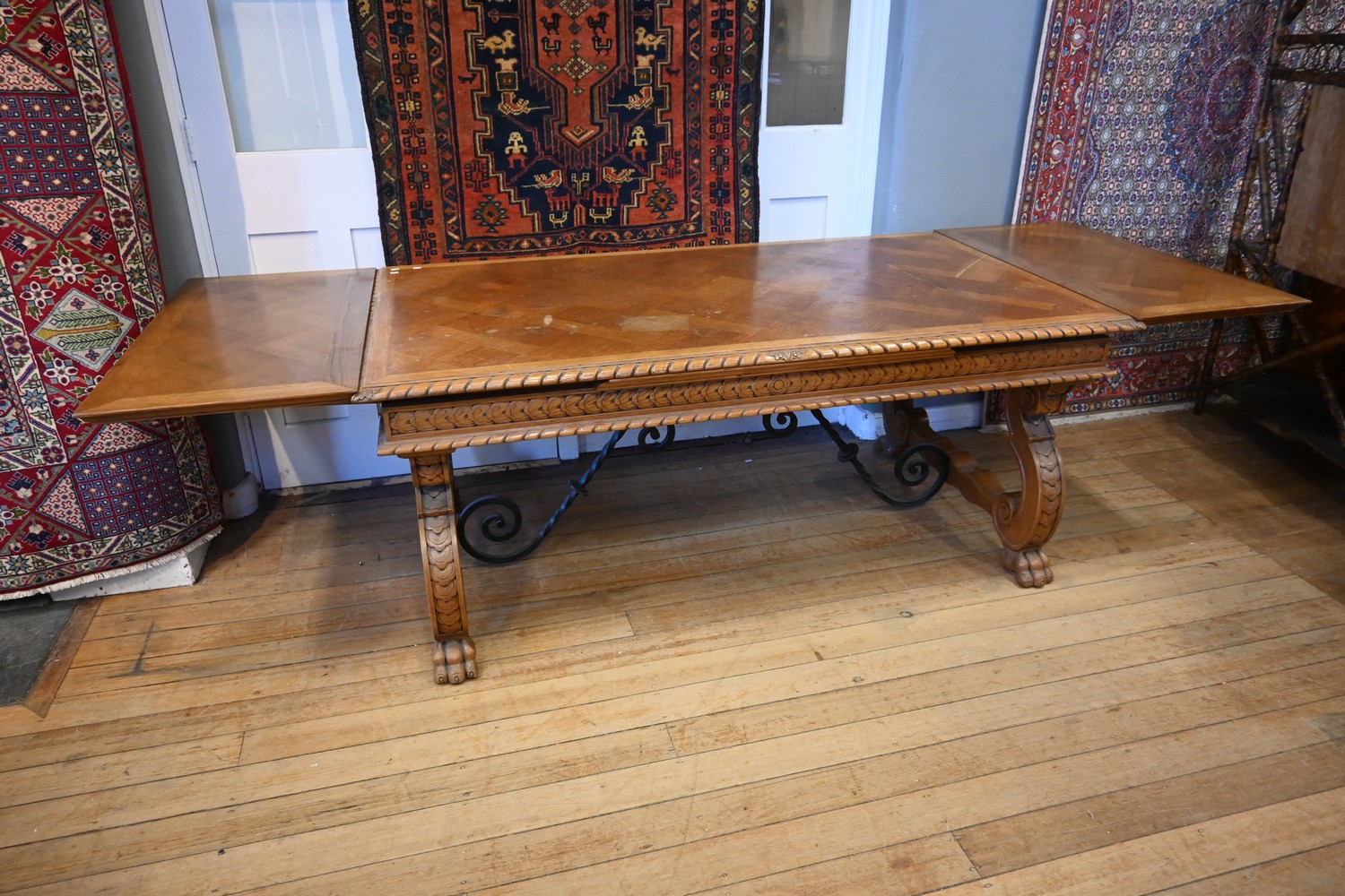 A SUBSTANTIAL ORNATELY CARVED EXTENSION DINING TABLE WITH FORGED IRON BASE (A/F) (78H X 276W X 100D CM) (PLEASE NOTE THIS HEAVY ITEM MUST BE REMOVED BY CLIENTS OR CARRIERS AT THE CUSTOMERS EXPENSE. LEONARD JOEL STAFF CANNOT ASSIST CARRYING THIS ITEM)