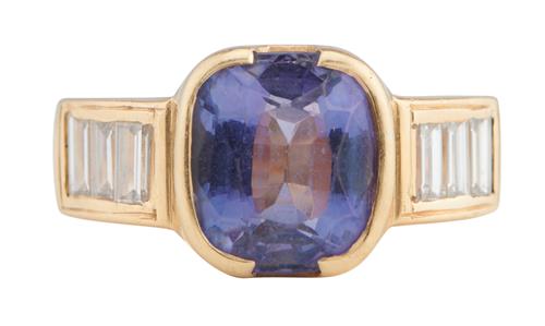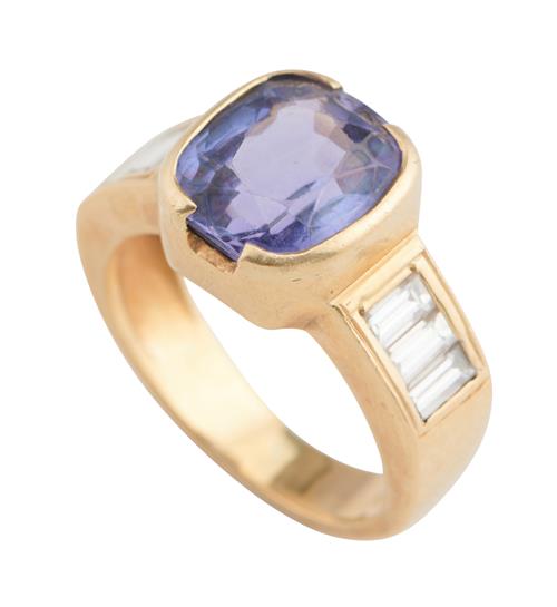 Centring a bezel-set cushion-cut tanzanite weighing approximately 3.70 carats, flanked by channel-set baguette-cut diamonds together weighing approximately 0.50 carats, size L.