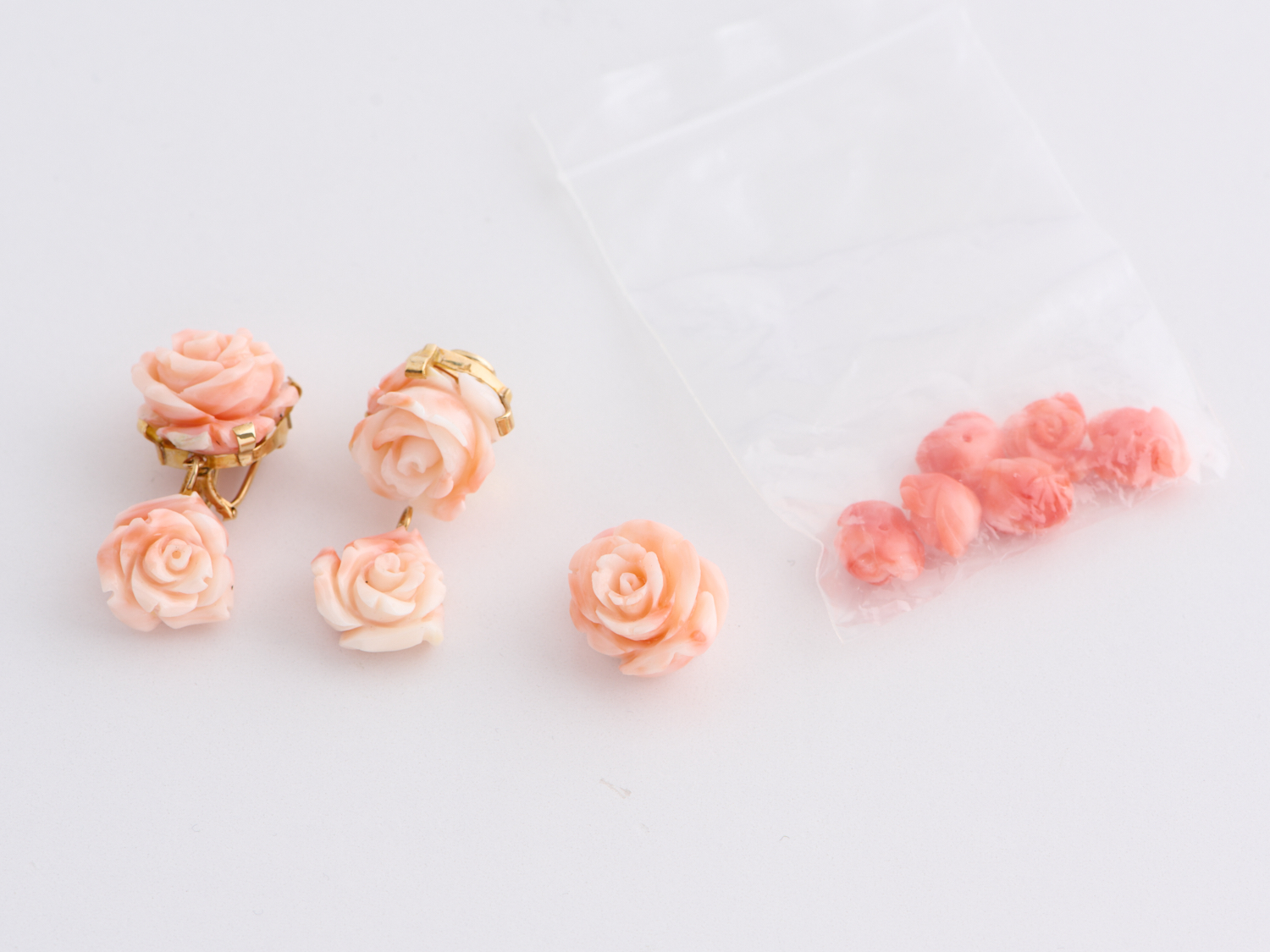 A PAIR OF FLORAL CORAL DROP EARRINGS TO CLIP FITTINGS WITH IN 14CT GOLD, SEVEN EXTRA CORAL PIECES