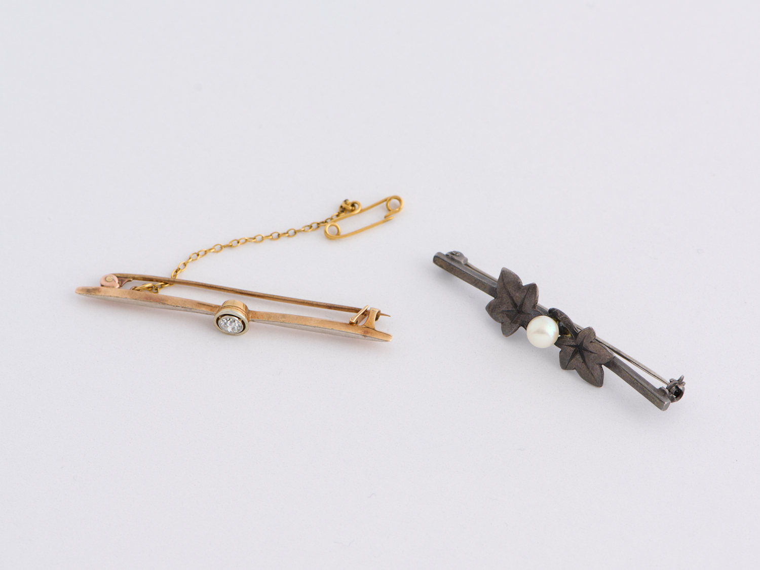 AN OLD CUT DIAMOND BROOCH IN 14CT GOLD AND PLATINUM, APPROXIMATE LENGTH 55MM , APPROXIMATE WEIGHT 3.4GMS, THE DIAMOND WEIGHING APPROXIMATELY 0.25CTS, WITH A PEARL SET BROOCH IN SILVER, APPROXIMATE LENGTH 50MM, APPROXIMATE WEIGHT 4.3GMS