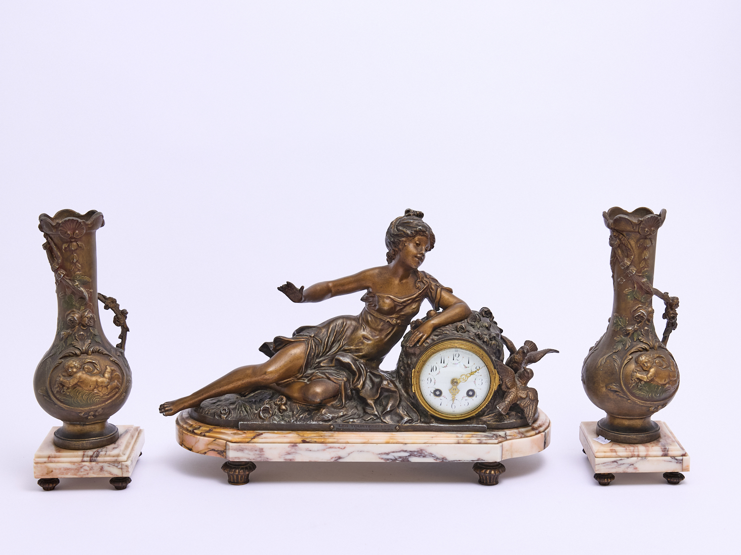 A FRENCH MARBLE AND SPELTER FIGURAL THREE-PIECE CLOCK GARNIATURE WITH CHERUBS AND BIRD DECORATION W.46CM (LARGEST), LEONARD JOEL LOCAL DELIVERY: MEDIUM