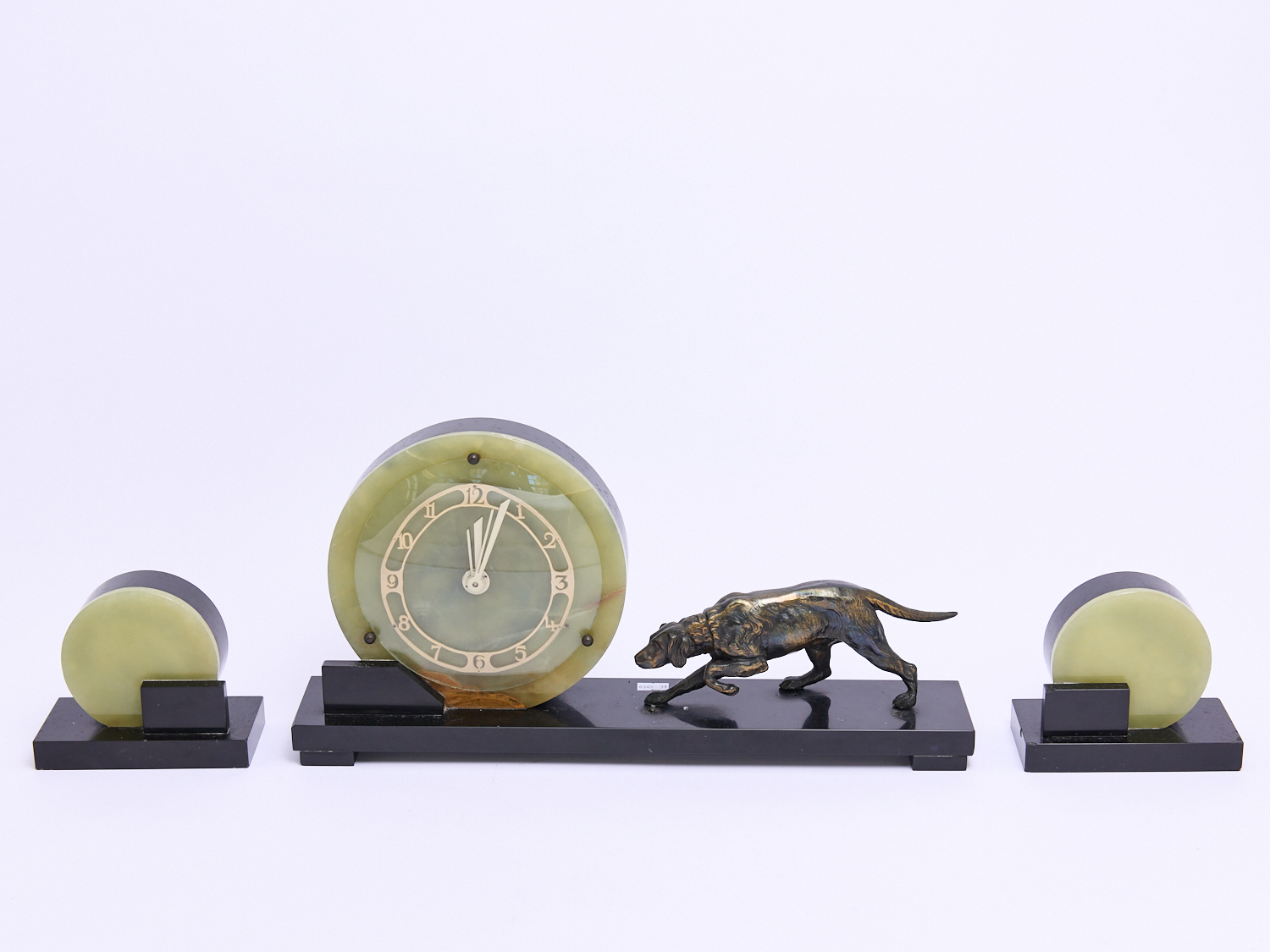 AN ART DECO ONYX AND SPELTER DOG ADORNED THREE-PIECE CLOCK GARNIATURE (A/F) W.45CM (LARGEST), LEONARD JOEL LOCAL DELIVERY: MEDIUM