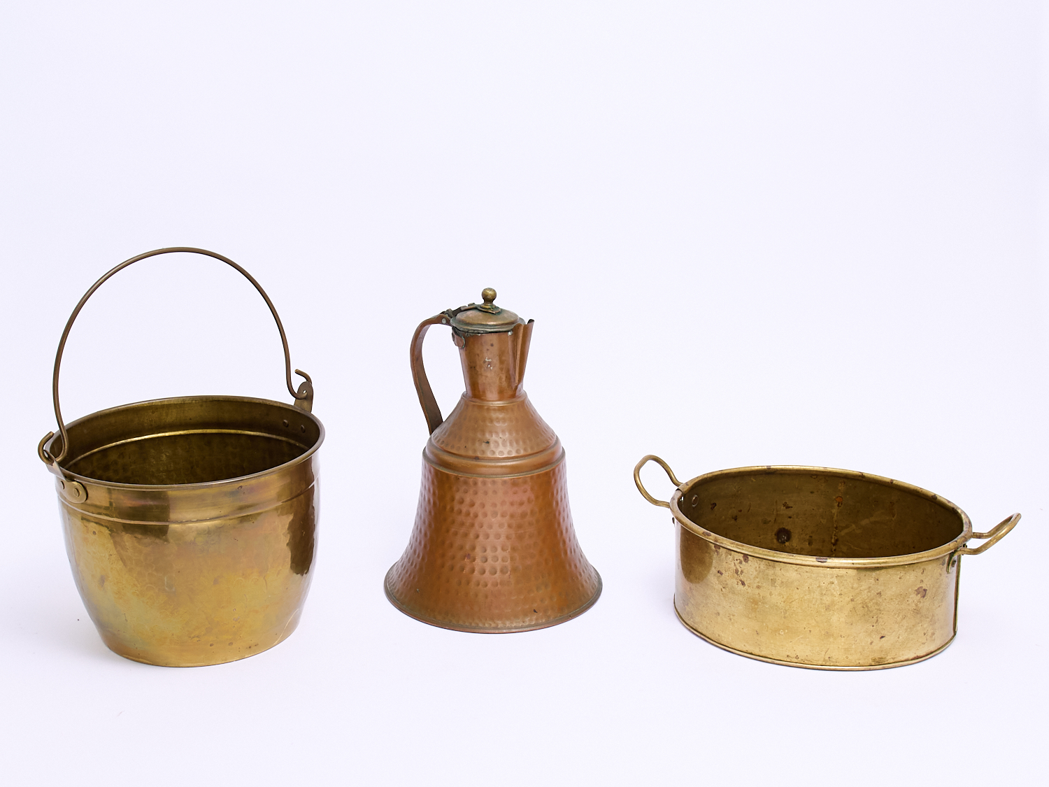 TWO 20TH CENTURY BRASS POTS AND A HAND BEATEN LIDDED COPPER POT, L.32CM (TALLEST), LEONARD JOEL LOCAL DELIVERY: MEDIUM