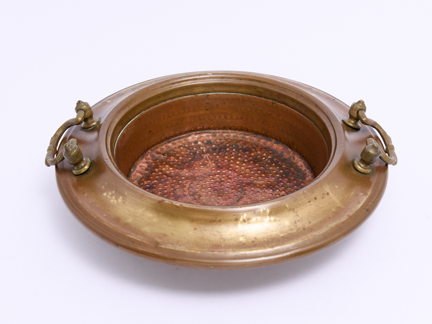 A COPPER AND BRASS TWO HANDLED CHESTNUT ROASTING BOWL, DIA.43CM, LEONARD JOEL LOCAL DELIVERY: MEDIUM