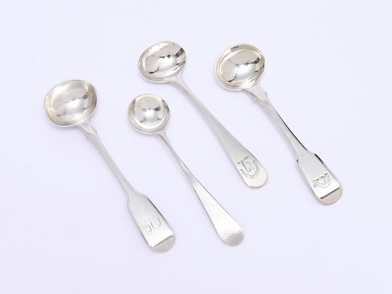 FOUR GEORGIAN STERLING SILVER SALT AND MUSTARD SPOONS - 46 GRAMS L.11CM, LEONARD JOEL LOCAL DELIVERY: SMALL