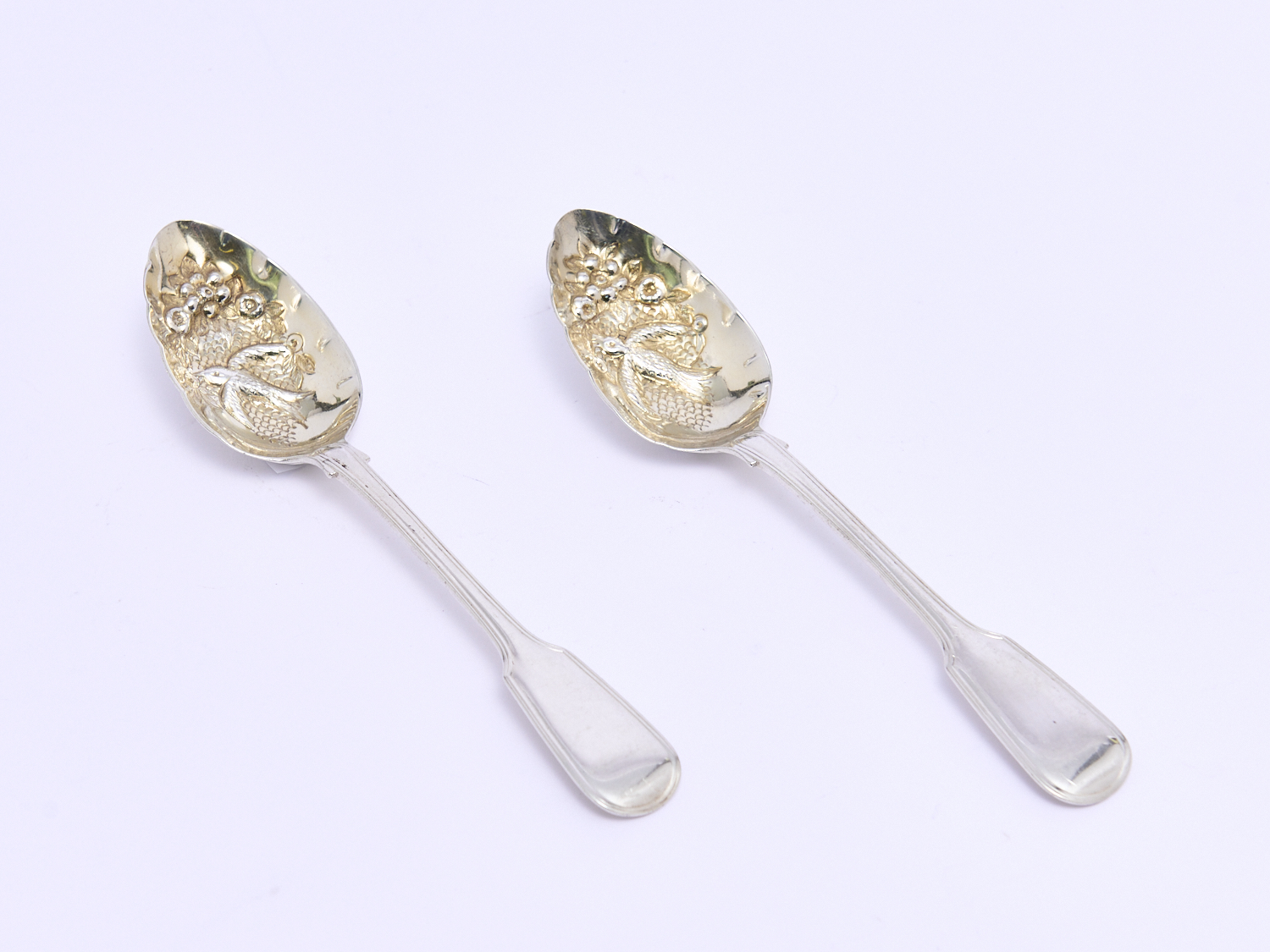 A PAIR OF VICTORIAN STERLING SILVER BIRD DECORATED GILT BOWL BERRY SPOONS - 170 GRAMS L.22CM, LEONARD JOEL LOCAL DELIVERY: SMALL