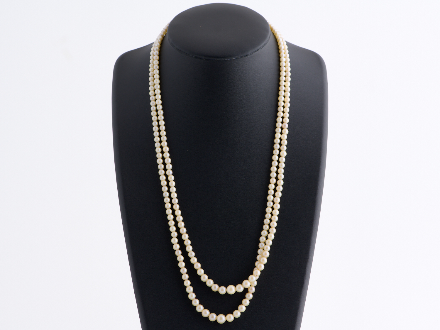 A VINTAGE DOUBLE STRAND OF GRADUATED CULTURED PEARLS, TO A MARCASITE CLASP IN STERLING SILVER, LENGTH 490MM