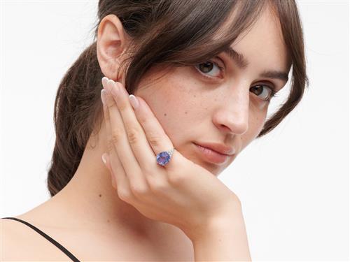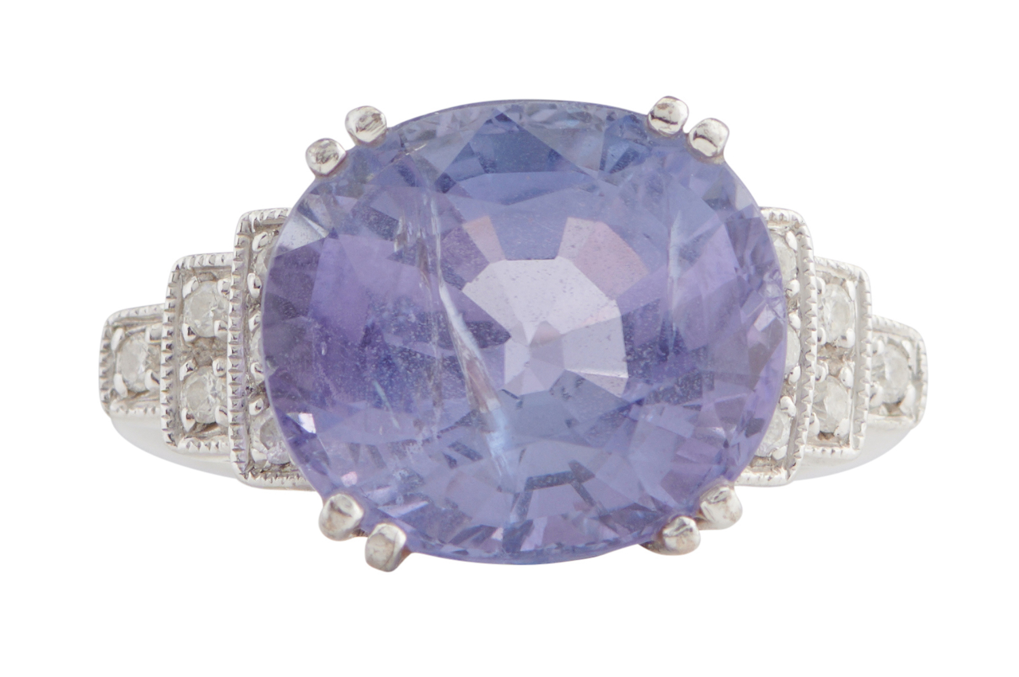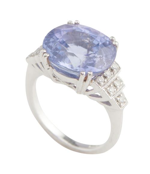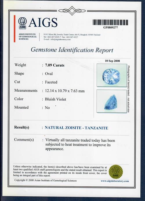 Centring a claw-set oval-cut tanzanite weighing 7.09 carats, to stepped diamond set shoulders, size I 1/2. Accompanied by AIGS Gemstone Identification Report number GF0809277 dated 10th September 2008, stating Natural Zoisite, Tanzanite.