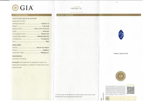 Of open design, the ends terminating in a claw-set marquise-cut sapphire weighing 2.33 carats and three trillion-cut yellow diamonds together weighing approximately 0.25 carats, size O. Accompanied by GIA Gemological Report number 1187351113 dated 26th September 2014 stating sapphire origin Madagascar.