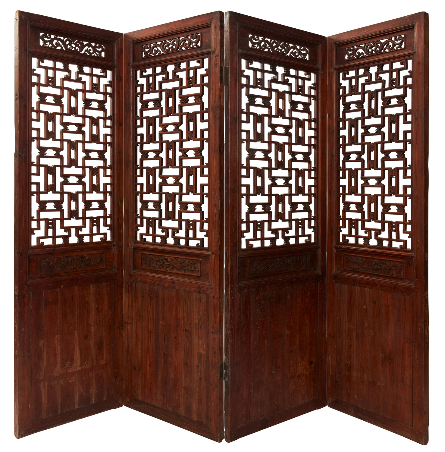 Qing Dynasty, late 19th century, each panel with a scrolled section above a lattice with carved flowerheads and a sliding privacy panel to the rear, and a relief carved panel with foliage and fruit above the solid base.