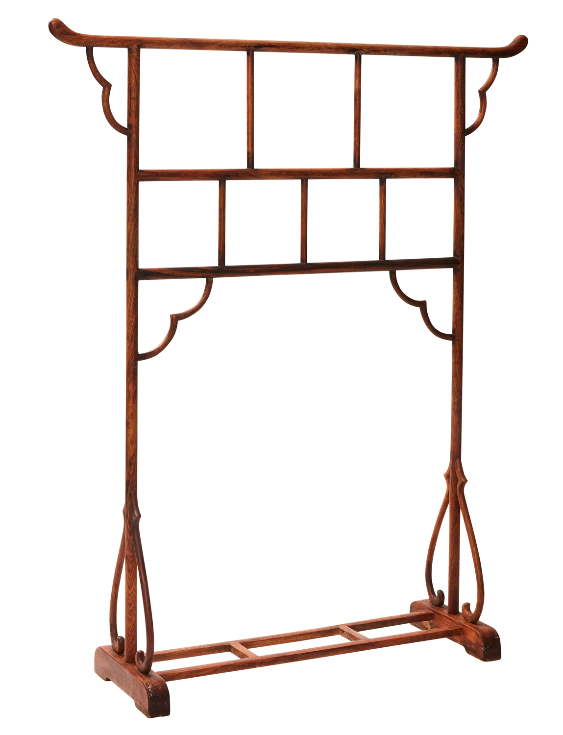 Having a shaped top rail, turned members, the end supports joined by square stretchers.