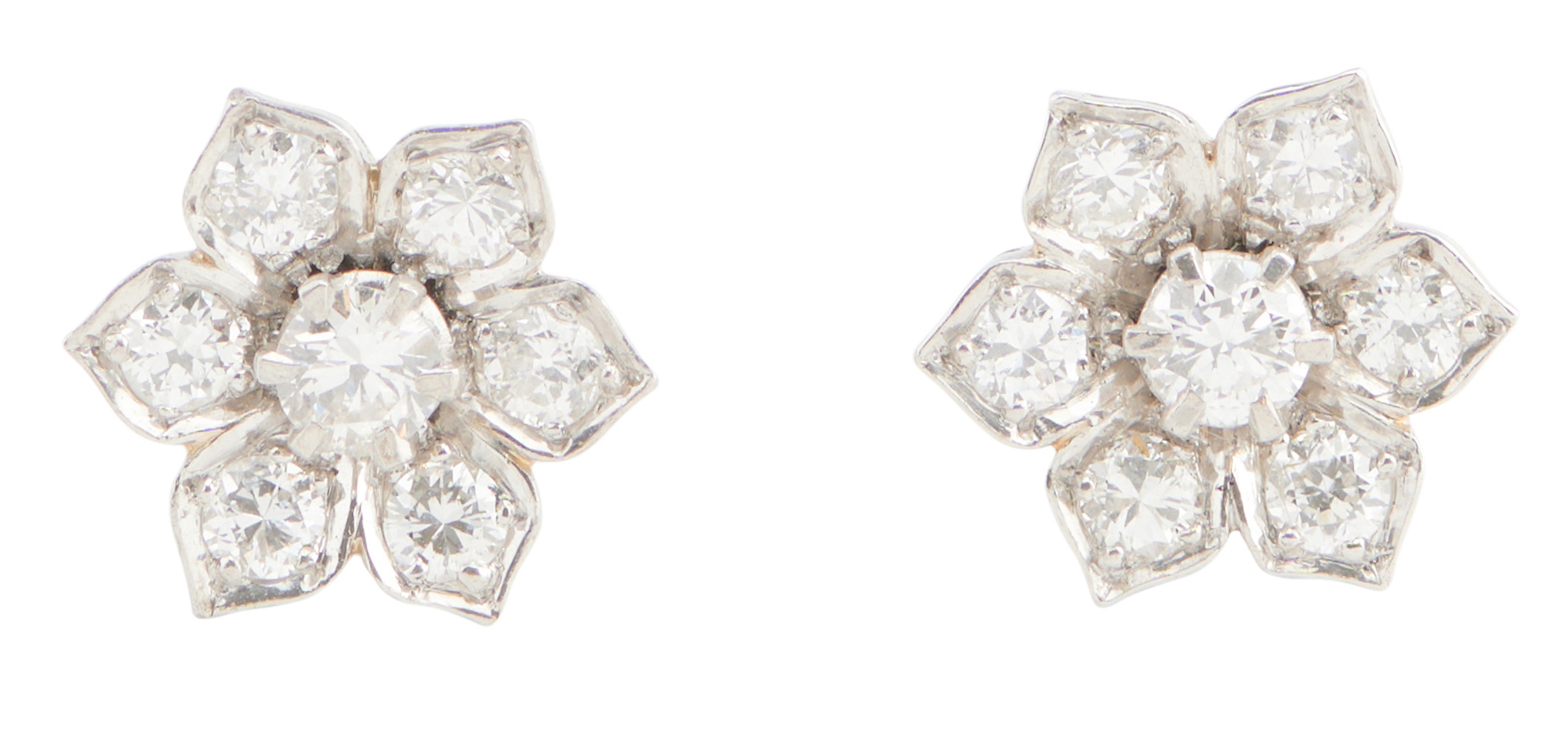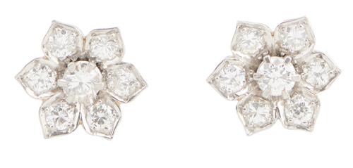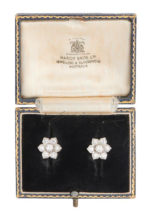 Of floral cluster design, each earring centring a brilliant-cut diamond weighing approximately 0.18 carats within a surround of six further diamonds together weighing approximately 0.50 carats, to post and butterfly fittings, accompanied by a period Hardy bros. box.