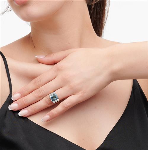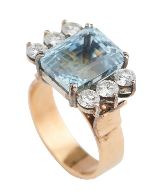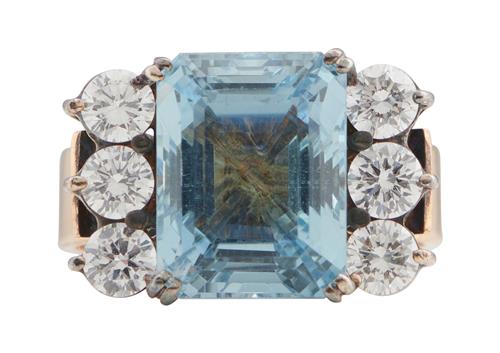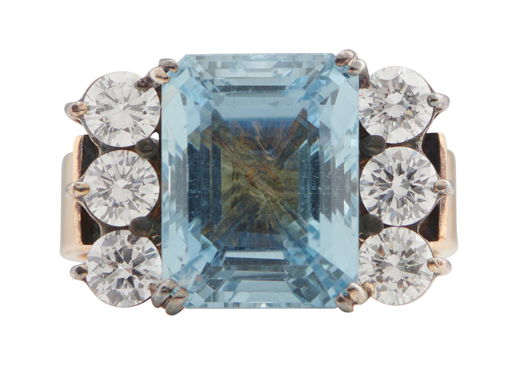 Centring a claw-set emerald-cut aquamarine weighing approximately 6.20 carats, flanked by a row of three claw-set brilliant-cut diamonds together weighing approximately 1.20 carats, size N.