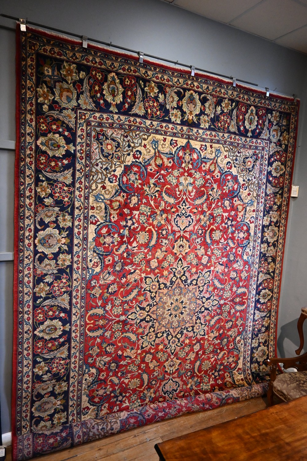 A PERSIAN ISFAHAN NAJAFABAD CARPET. 100% WOOL PILE HAND KNOTTED WITH A CLASSIC ISFAHAN DESIGN OF CENTRAL MEDALLION AND QUARTERED CORNER MEDALLIONS IN BLUE & CREAM. ALL OVER PATTERN OF 16 CENTURY SHAH ABBASI PALMETTES, FLORAL SPRAYS & SAZ LEAVES WITHIN A ROYAL CRIMSON FIELD. BEAUTIFUL BORDER OF PALMETTES, BUNCHES OF FLORAL SPRAYS AND TENDRILS ON A ROYAL BLUE FIELD SIZE: 430 X 295 CM ORIGIN: PERSIA - RRP: $5,900 DOCUMENTATION OF AUTHENTICITY INCLUDED.