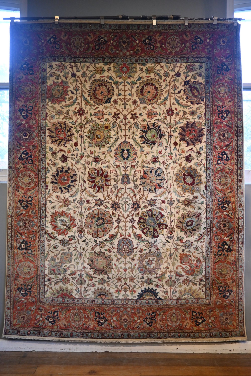 A PRISTINE & MOST ATTRACTIVE SERAPI HERIZ DESIGN CARPET, VERY FINELY HAND-KNOTTED WITH THE FINEST HANDSPUN WOOL AND NATURAL DYES. NEW GALLERY CARPET BEING OFFERED. THE CARPET IS PERFECTLY BALANCED IN COLOUR & DESIGN IN TONES OF RUST, BEIGE, FRENCH BLUE & INDIGO BLUE & CREAM. EXTREMELY HARD WEARING. IN PRISTINE, NEW CONDITION. AN ABSOLUTELY STUNNINGF CARPET FOR ALL SETTINGS. SIZE: 301 X 230 CM ORIGIN: AGRA - RRP: $9,800 DOCUMENTATION OF AUTHENTICITY INCLUDED.