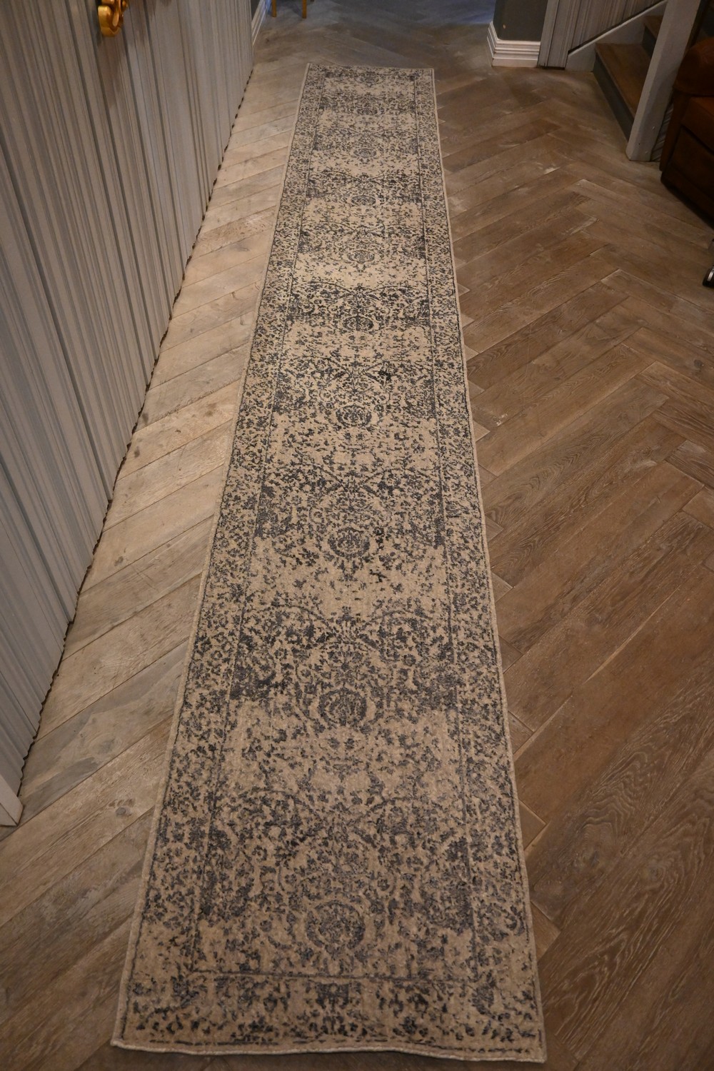 BRAND NEW CONTEMPORARY TRANSITIONAL DESIGNER RUNNER. HANDLOOMED WOOL PILE. ERASED SILKY TEXTURE.IN TONES OF GREY & CHARCOAL. SIZE: 506 X 78 CM ORIGIN: ARGA INDIA - RRP: $2,700 DOCUMENTATION OF AUTHENTICITY INCLUDED.