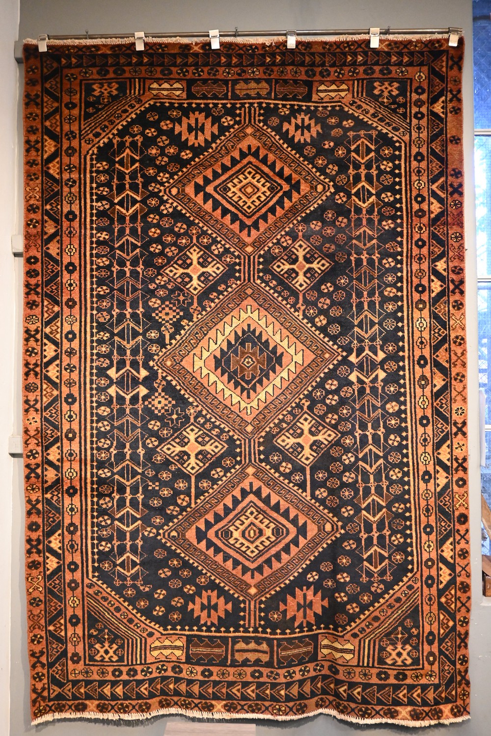A CIRCA 1950S VINTAGE PERSIAN KOOHI RUG, 100% WOOL PILE WITH NATURAL DYES. HAND-KNOTTED TRIBAL WEAVE WITH DESIGN OF TRIPLE DIAMOND ANCHORED MEDALLION IN FIELD OF TRIBAL ROSSETES IN TAN AND RUST TONES ON A NAVY-BLUE FIELD. BORDER OF GEOMETRIC PATTERNS. RESTORED & IN CLEAN CONDITION. SIZE: 268 X 175 CMORIGIN: PERSIA - RRP: $4400 DOCUMENTATION OF AUTHENTICITY INCLUDED.