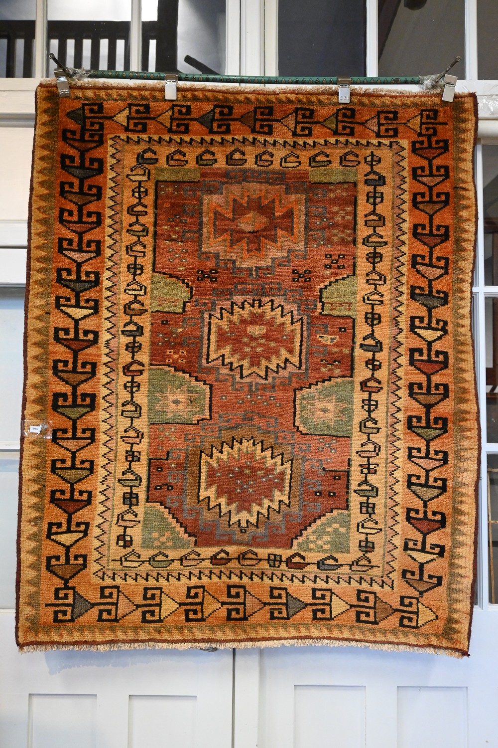 A BEAUTIFUL HAND-KNOTTED PERSIAN LURI RUG, WOOL PILE, NATURAL DYES. TRIPLE TRIBAL MEDALLIONS WITHIN A RUST RED FIELD OF TRIBAL MOTIFS. MINOR BORDER OF PAISLEY MOTIFS. MAJOR BORDER OF TRIBAL WAVES. SOFT MELLOW TONES THROUGHOUT. SIZE: 158 X 130 CM ORIGIN: PERSIA - RRP: $1800 DOCUMENTATION OF AUTHENTICITY INCLUDED