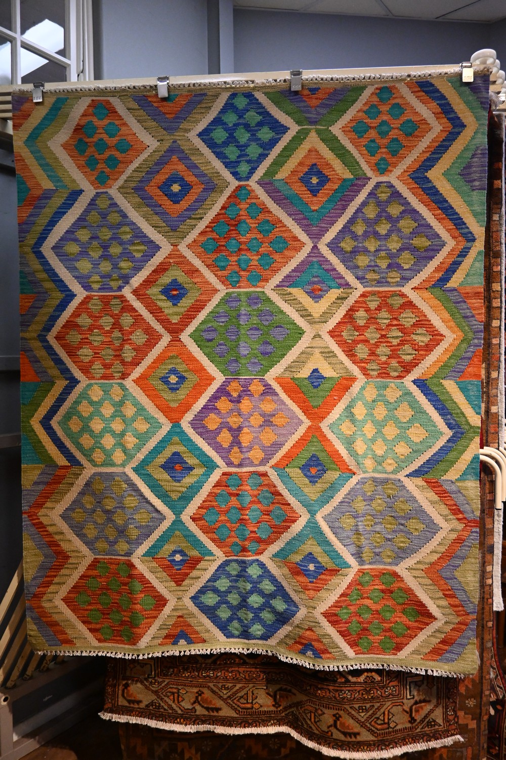 A NEW COLOURFUL & DECORATIVE KILIM KAVKAZI RUG.100% PURE HAND SPUN WOOL, HAND WOVEN. REVERSABLE, CAUCASIAN INFLUENCE AND DESIGN. SIZE: 187 X 156 CM ORIGIN: AFGHANISTAN/PESHAWER BORDER - RRP: $1,400 CERTIFICATE OF AUTHENTICITY INCLUDED