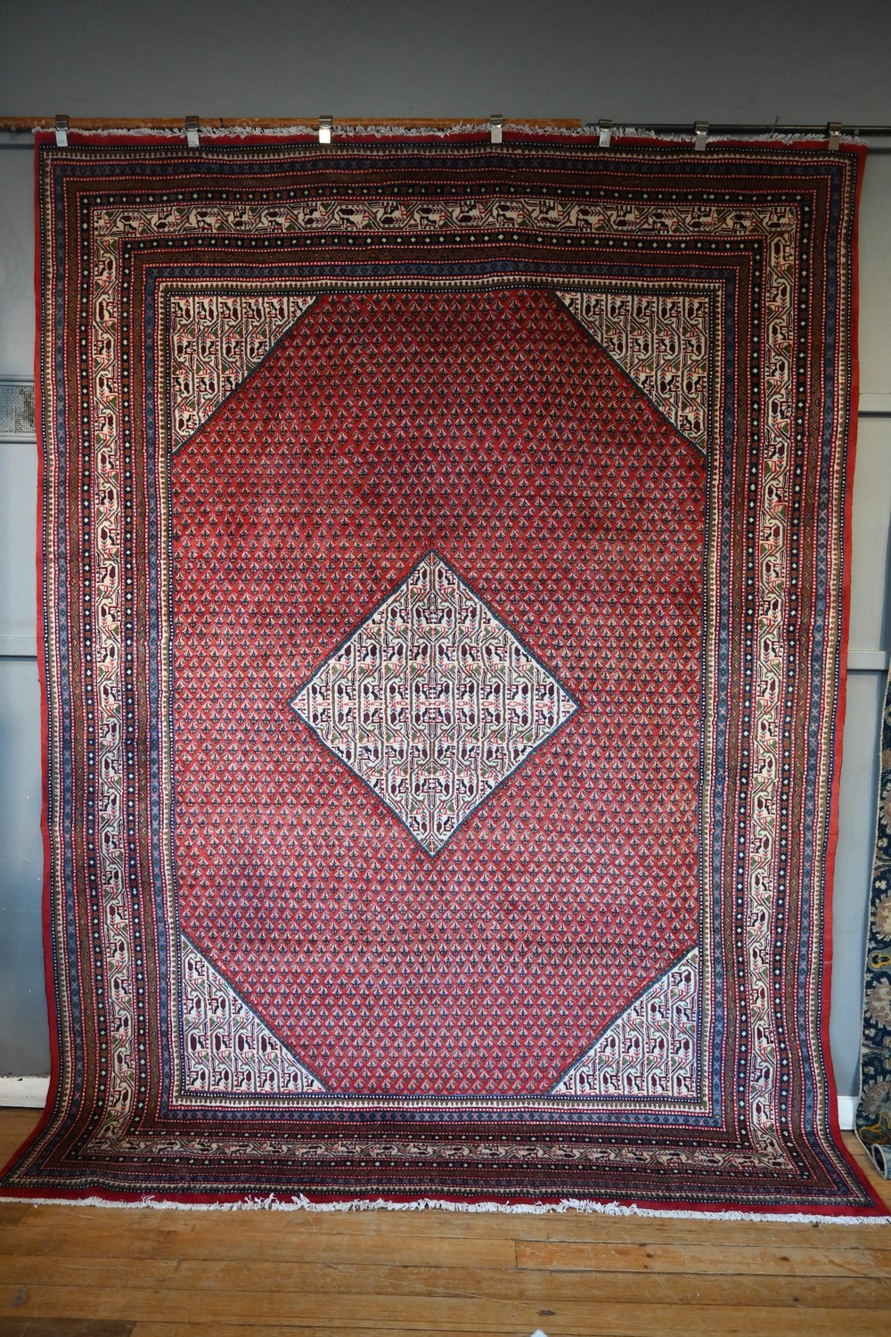 A PERSIAN MIR SERABAND RUG,100% WOOL PILE, SOLID AND HARD-WEARING. HAND-KNOTTED VILLAGE WEAVE WITH TRADITIONAL DESIGN OF DIAMOND-SHAPED MEDALLION CONTAINING MOTIFS SET WITHIN A FIELD OF PAISLEY PATTERNS. BORDER OF FLORAL MOTIFS AND ANIMAL FORM. IN GOOD CLEAN CONDITION. SIZE:350 X 263CM ORIGIN: PERSIA- RRP $4900 DOCUMENTATION OF AUTHENTICITY INCLUDED