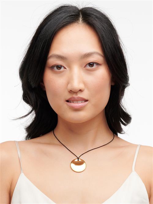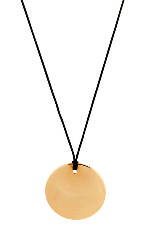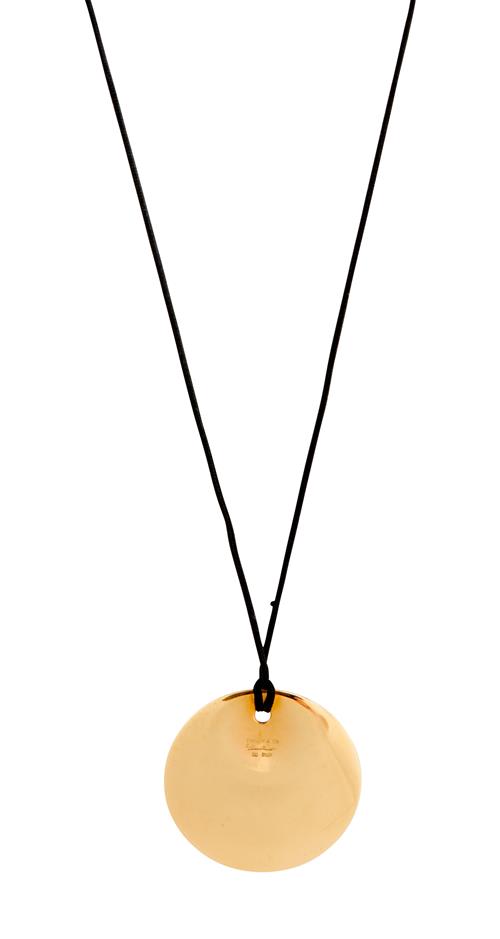 The circular pendant of polished finish, signed Elsa Peretti, Tiffany & Co., diameter approximately 35mm, suspended from a black silk cord, length approximately 370mm adjustable; earrings ensuite, diameter approxiamtely 22mm, to shepherd hook fittings, one hook deficient.