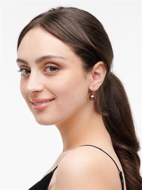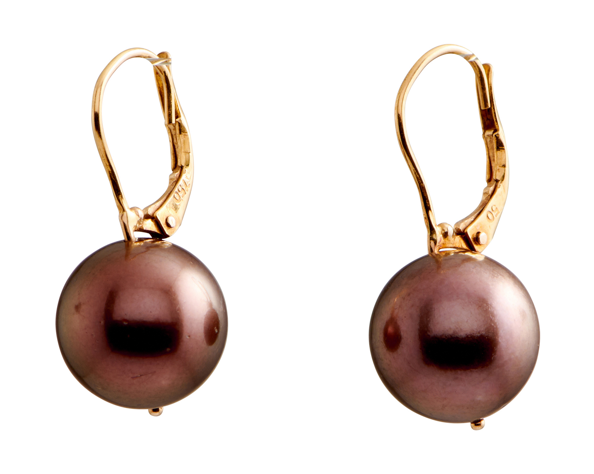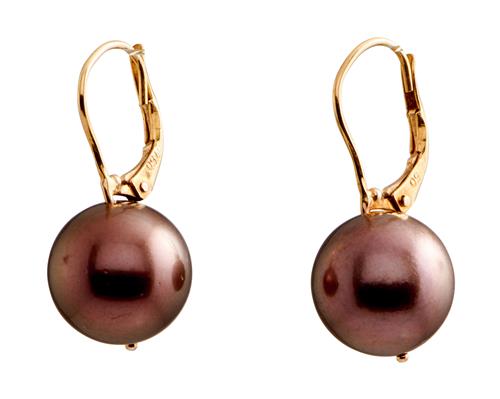 Each earring comprising a round pearl of deep bronze hues measuring approximately 12.1mm, to European hook fittings, length approximately 26mm.